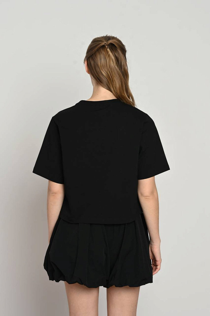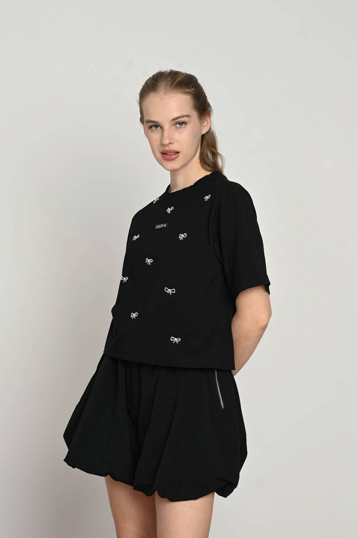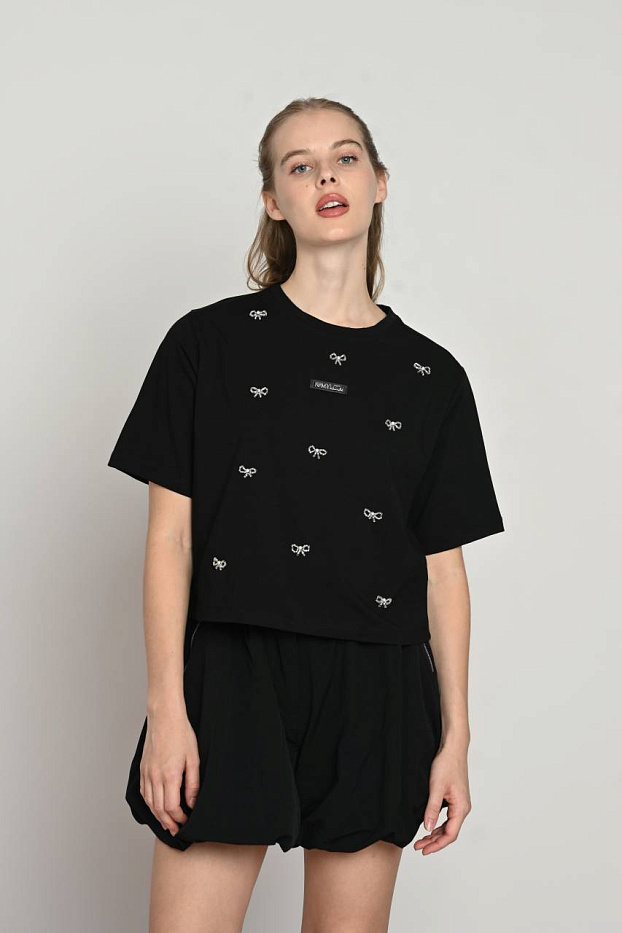 Футболка черного цвета с бантиками из бисера станет стильным и оригинальным выбором для девочки. Модель отличается аккуратным декором, который добавляет нежности и изящества образу. Украшения в виде маленьких бантиков придают изделию изысканность и делают его особенным в повседневном гардеробе. Материал мягкий и приятный на ощупь, обеспечивая комфорт при носке в течение всего дня. Такой фасон идеально подходит для создания нежного и одновременно модного образа, легко комбинируется с различными элементами одежды. Изящные детали из бисера выделяют изделие на фоне других, придавая ему неповторимый шарм. Это практичная и элегантная вещь, которая быстро станет любимой частью гардероба девочки, подчеркивая ее индивидуальность и стиль.