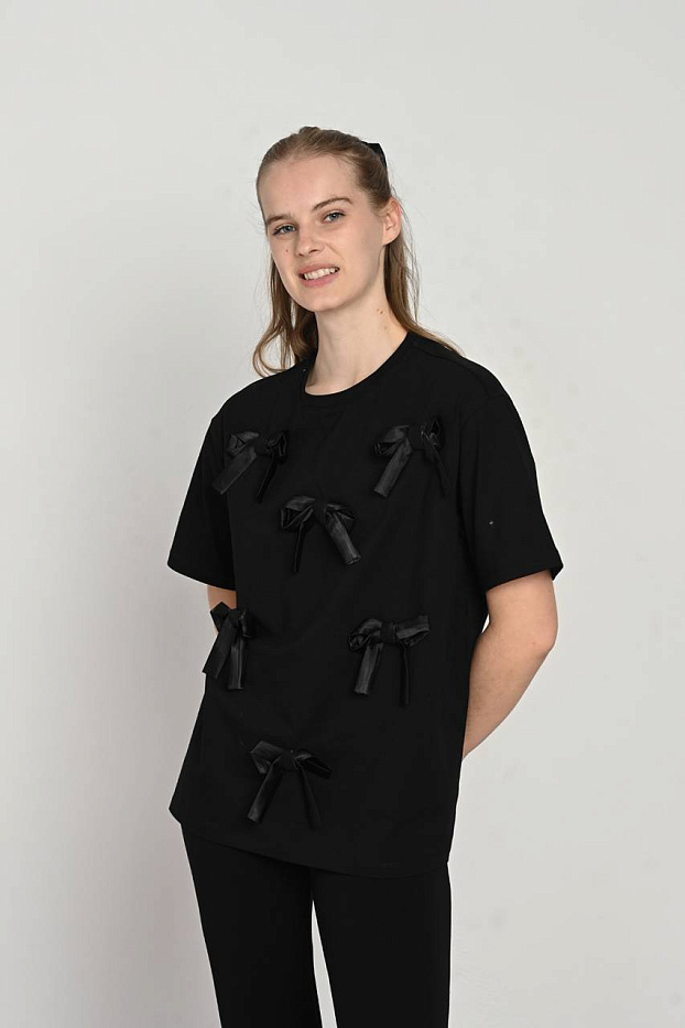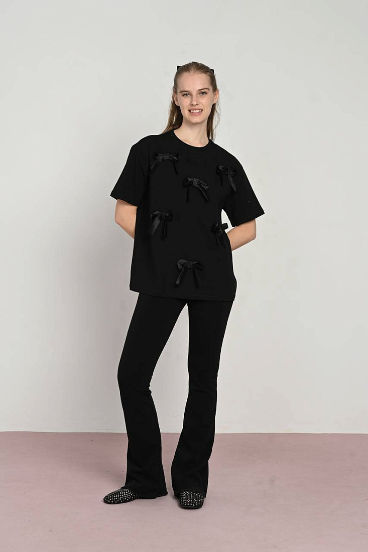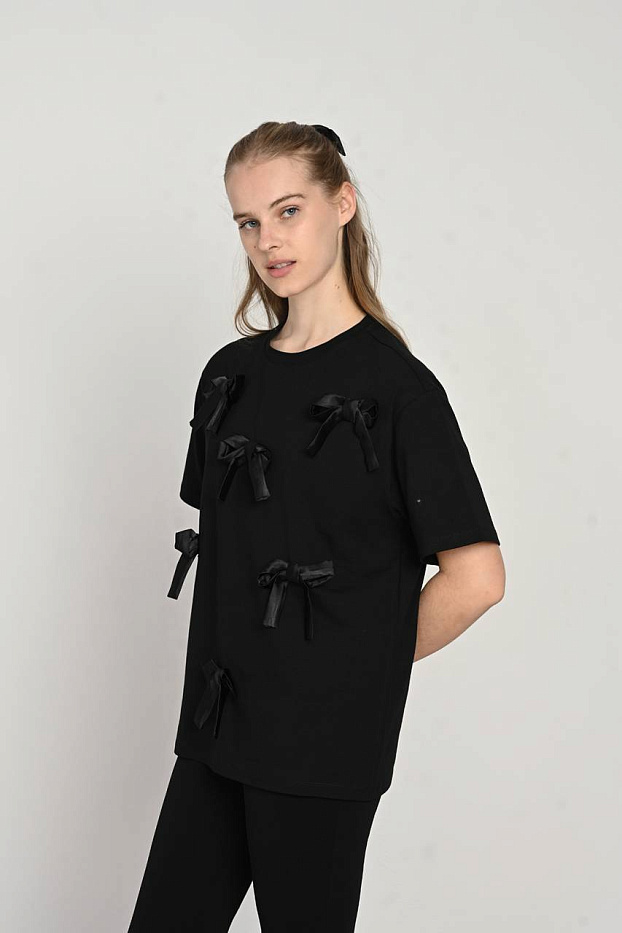 Черная футболка с атласными бантиками создана специально для девочки, которая ценит комфорт и стиль в повседневной одежде. Изделие изготовлено из мягкого и дышащего материала, что обеспечивает комфортное ношение в течение всего дня. Легкая текстура ткани позволяет коже дышать, предотвращая ощущение жары и раздражения. Элегантный дизайн футболки подчеркнут аккуратными атласными бантиками, добавляющими нежности и изящества образу. Такая деталь делает вещь универсальной для разных мероприятий — от прогулок до торжеств. Футболка отлично сочетается с разнообразными элементами гардероба, позволяя создавать как повседневные, так и более нарядные комплекты. Практичность изделия выражается в простой и быстрой уходе, благодаря устойчивости ткани к частым стиркам. Модель разработана с учетом особенностей детской фигуры, обеспечивая свободу движений и удобство в использовании. Выбор этой футболки — оптимальное решение для тех, кто хочет сочетать комфорт и изысканность в детском образе.