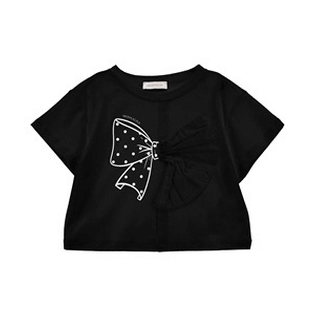 Футболка для девочки выполнена из мягкого материала, который приятно ощущается на коже и обеспечивает комфорт в течение всего дня. Классический крой и короткие рукава делают изделие универсальным для повседневной носки, а также подходят для прогулок и активного отдыха. Основной цвет — насыщенный черный, что придает изделию стильный и современный вид. На передней части футболки расположен крупный декоративный элемент в виде банта: часть банта выполнена из ткани с фактурной сборкой, другая часть — из принта с белыми горошками и контурной линией, создавая интересный контраст и добавляя образу оригинальность. Дизайн гармонично сочетается с любыми предметами гардероба, позволяя создавать яркие и запоминающиеся образы. Материал футболки легкий, дышащий, подходит для любого времени года, особенно для весны и лета. Качественные швы и аккуратная отделка подчеркивают надежность изделия.