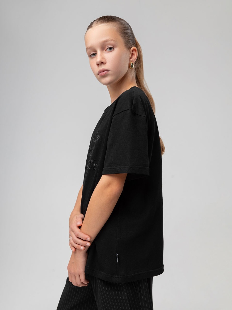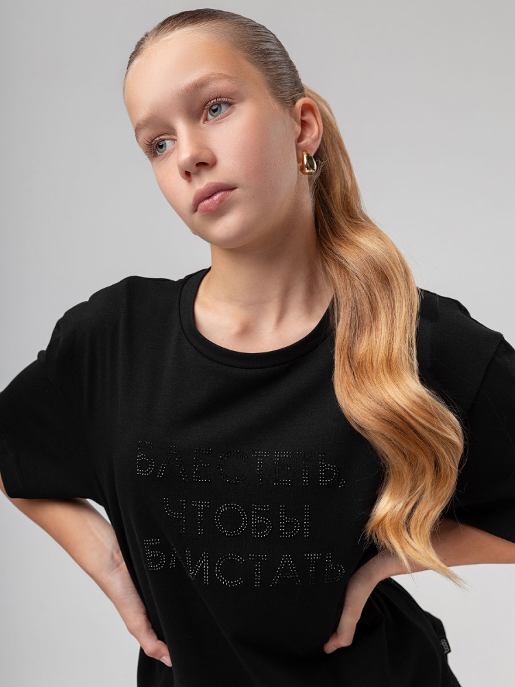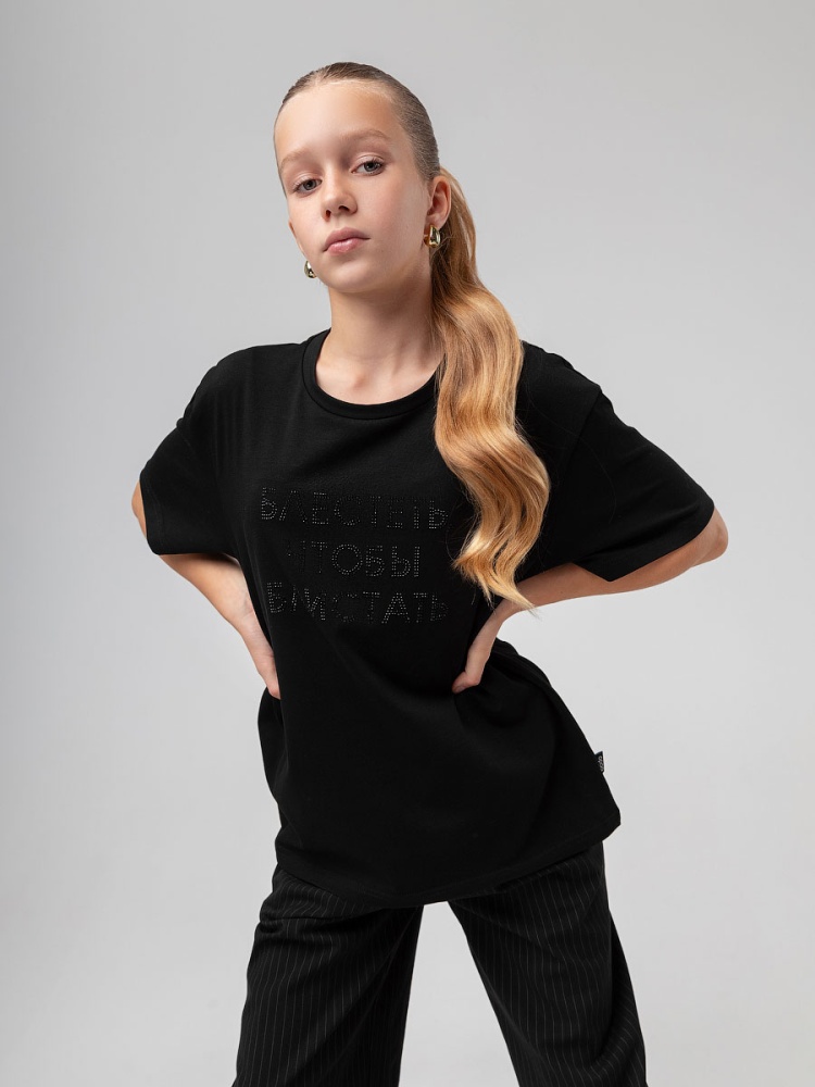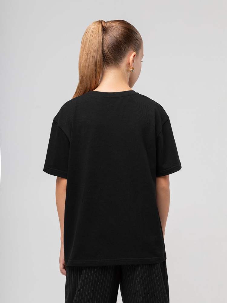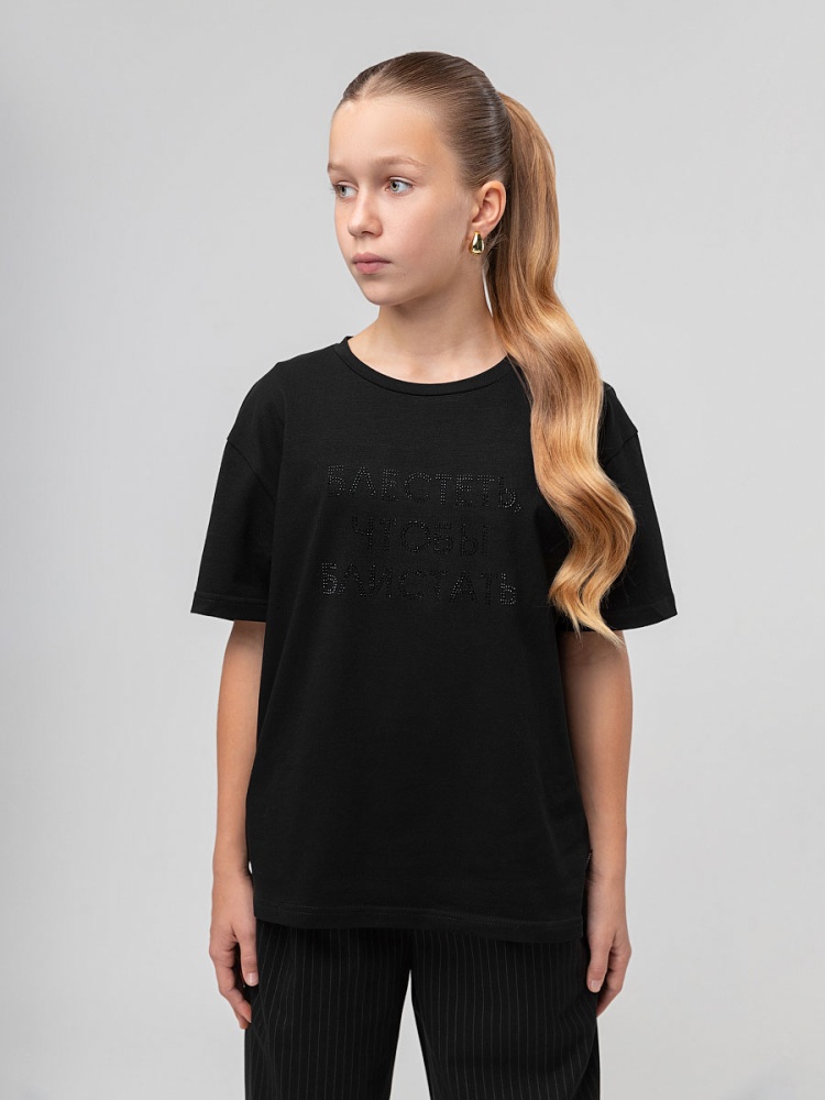 Футболка для детей школьного возраста. Футболка свободного силуэта с втачным коротким рукавом. Горловина футболки округлой формы. Низ изделия прямой. На полочке располагается принт.