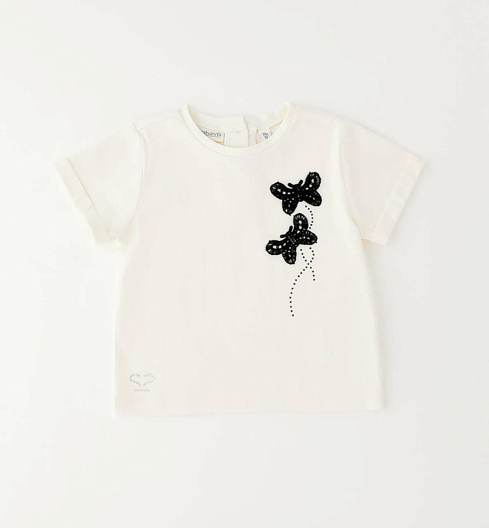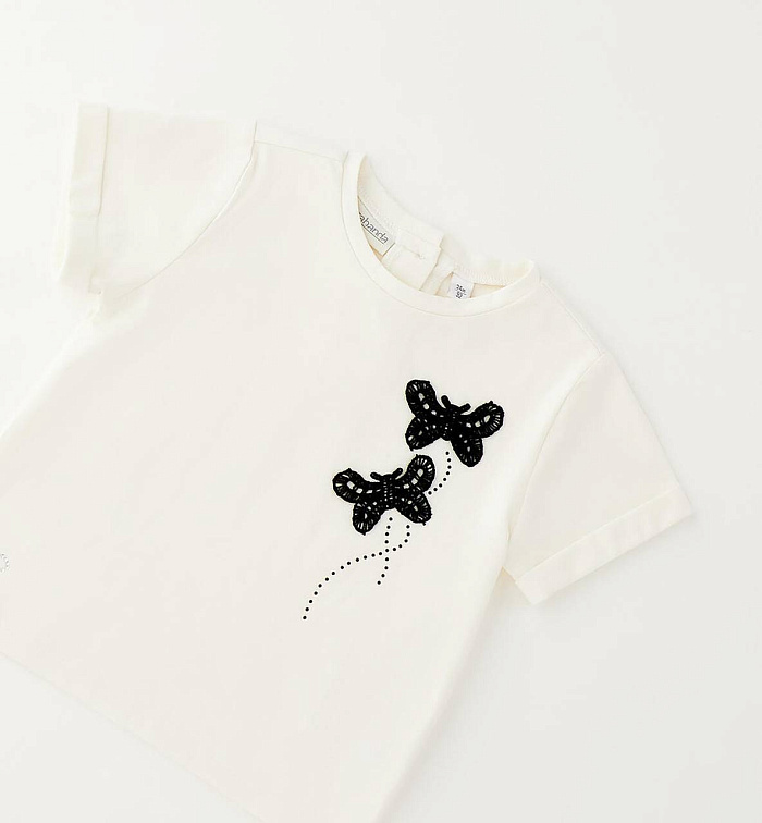 Футболка для девочек Sarabanda из эластичного хлопкового джерси. Сзади застегивается на пуговицы, размер до 3 лет. Передняя часть украшена стразами и аппликациями в технике макраме.