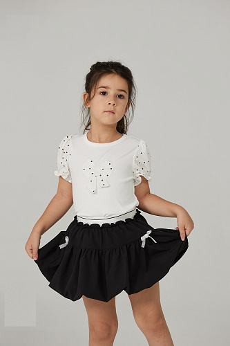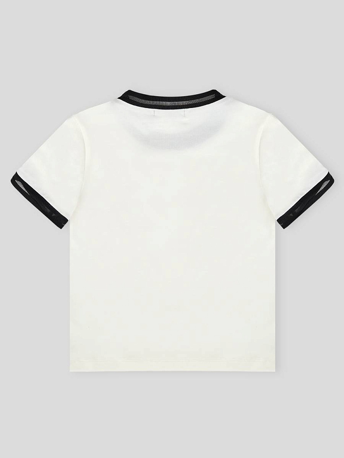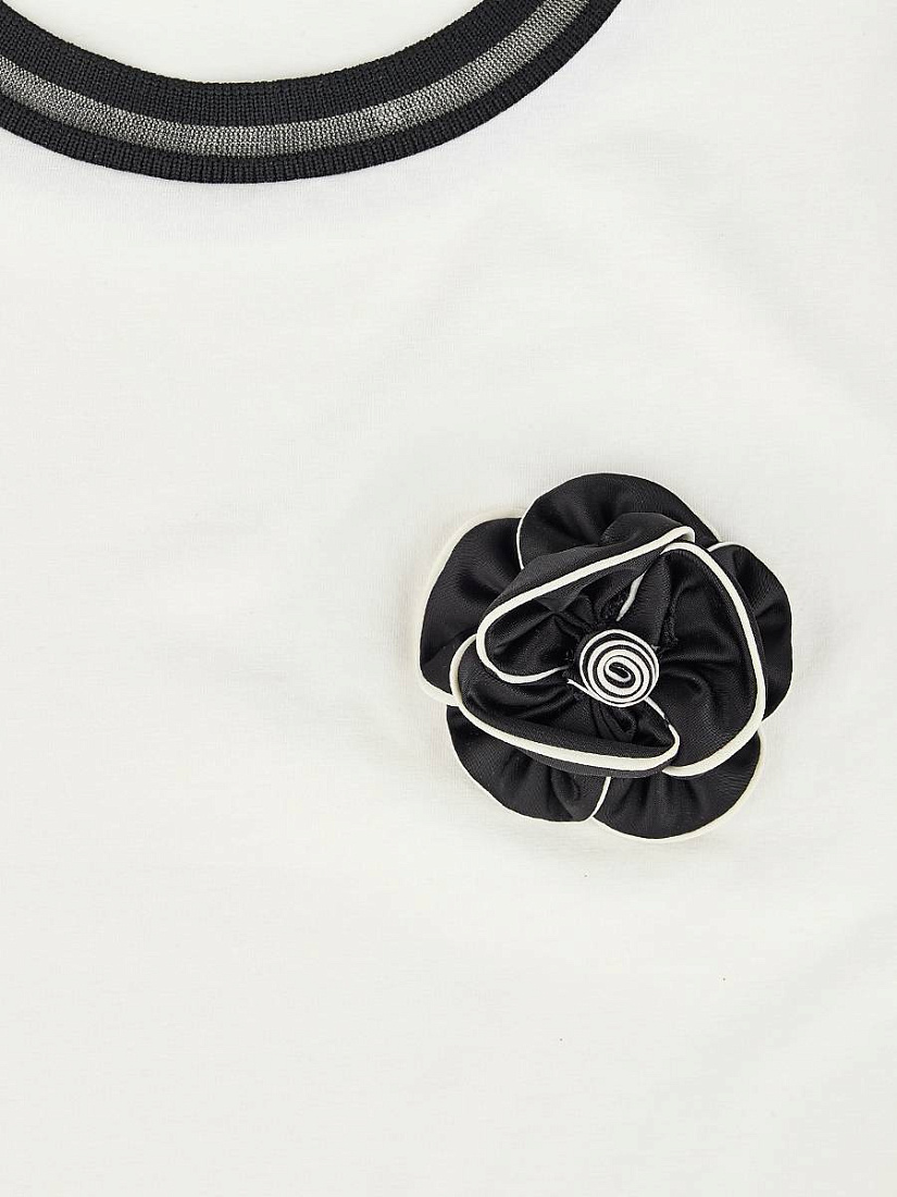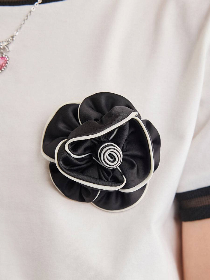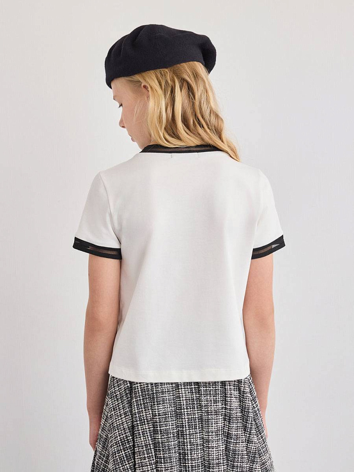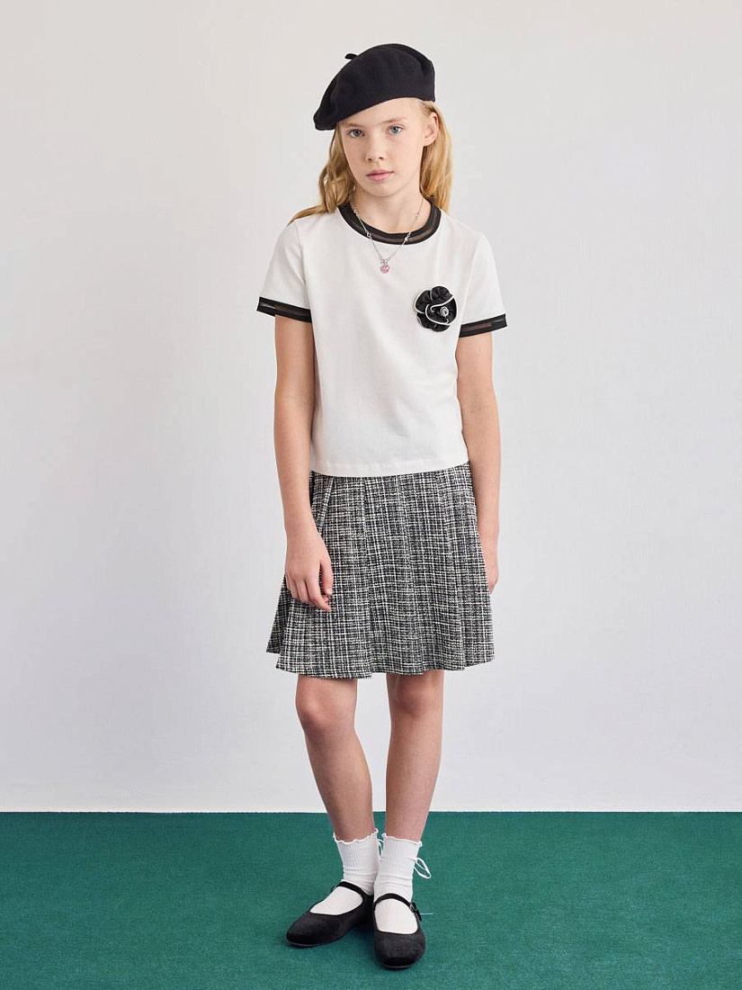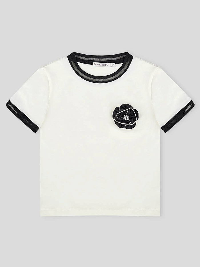 Футболка для девочки выполнена в универсальном стиле и отлично подходит для повседневной носки. Модель представлена в светлом оттенке с контрастными черными деталями на воротнике и рукавах, что придает изделию современный и аккуратный вид. На груди футболки расположен декоративный элемент в виде цветка, который добавляет образу индивидуальности и легкой элегантности. Материал футболки выглядит мягким и приятным на ощупь, обеспечивая комфорт в течение всего дня. Прямой крой изделия позволяет свободно двигаться и подходит для различных типов фигуры, что делает футболку практичным выбором для школьных и прогулочных образов. Дизайн лаконичный, без лишних деталей, что позволяет легко сочетать футболку с различными юбками, брюками или джинсами. Мягкая текстура ткани обеспечивает удобство даже при длительной носке, а аккуратная отделка швов говорит о качестве исполнения.
