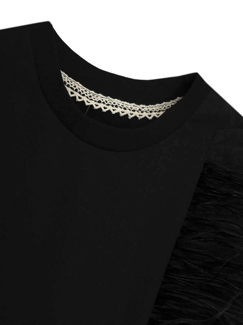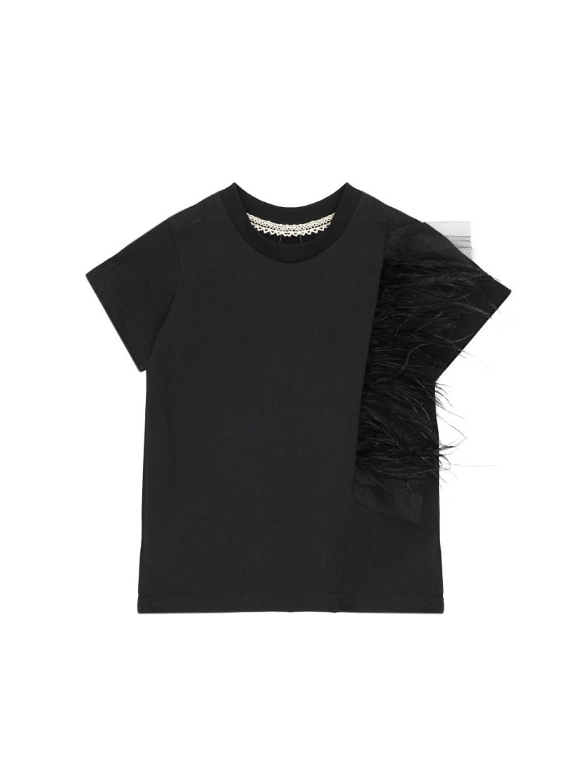 Футболка черная с перьями для девочки станет ярким элементом гардероба ребенка. Такой вариант одежды предназначен для повседневной носки, прогулок и праздничных мероприятий. Благодаря мягкому и приятному к телу материалу изделие подходит для комфорта в течение всего дня. Модель подчеркивает индивидуальность и модный стиль девочки, создает оригинальный образ и легко сочетается с различной одеждой.Легкие перья добавляют особое украшение и привлекают внимание. Такая декоративная деталь делает футболку необычной и актуальной для современных юных модниц, которые любят проявлять свою уникальность. Черная основа изделия универсальна и позволяет комбинировать эту вещь с брюками, юбками или джинсами.