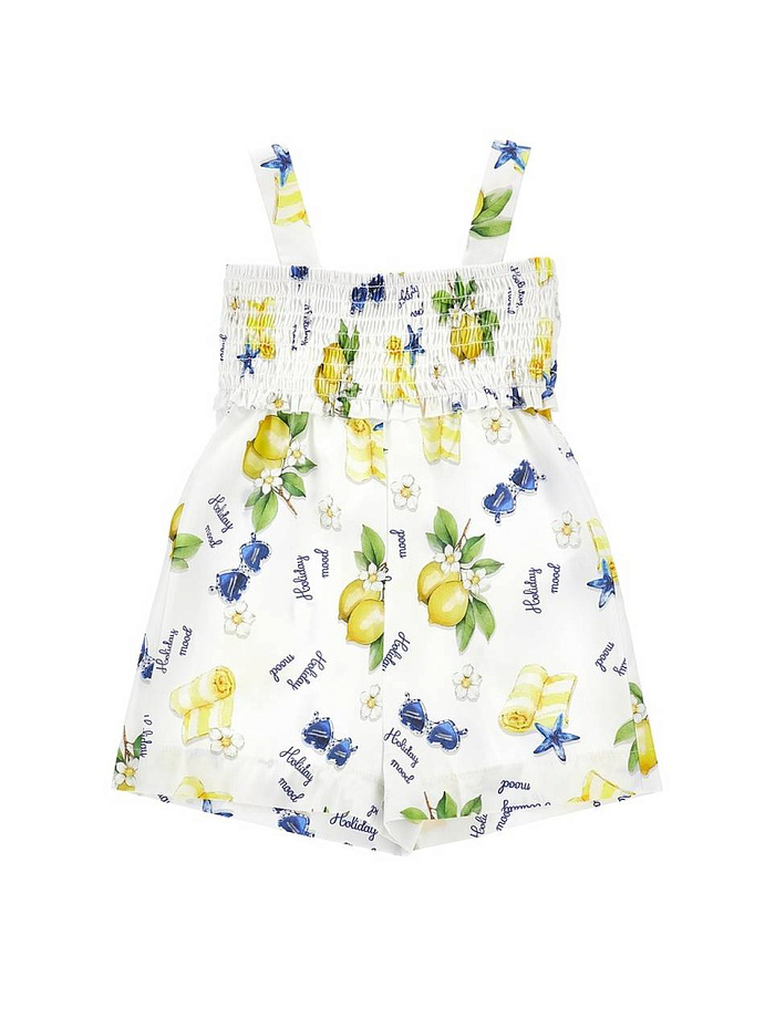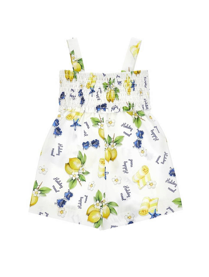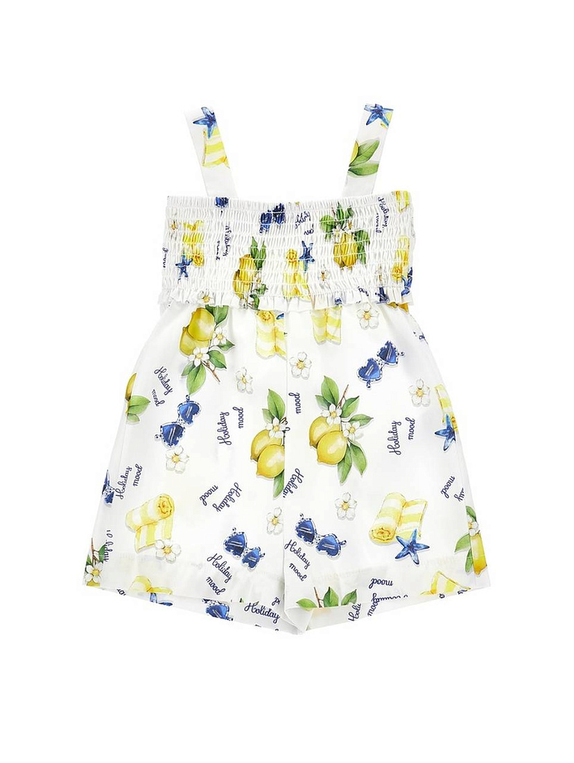 Комбинезон для девочки выполнен из легкой ткани, идеально подходящей для теплого времени года. Основной цвет изделия — белый, что придает образу свежесть и легкость. Поверхность украшена ярким и жизнерадостным принтом: по всей ткани равномерно расположены лимоны, синие цветы, зеленые листья и небольшие надписи, что создает позитивное настроение и подчеркивает летний стиль. Широкие бретели надежно фиксируют комбинезон на плечах, обеспечивая комфорт при носке и свободу движений. Верхняя часть выполнена с эластичной сборкой, благодаря чему изделие хорошо сидит по фигуре и не сковывает движения. Короткая длина шорт делает этот комбинезон отличным выбором для прогулок, активного отдыха или поездок на природу. Материал изделия гладкий, приятный на ощупь, не раздражает кожу и легко стирается. Яркие элементы принта сохраняют насыщенность даже после многократных стирок.