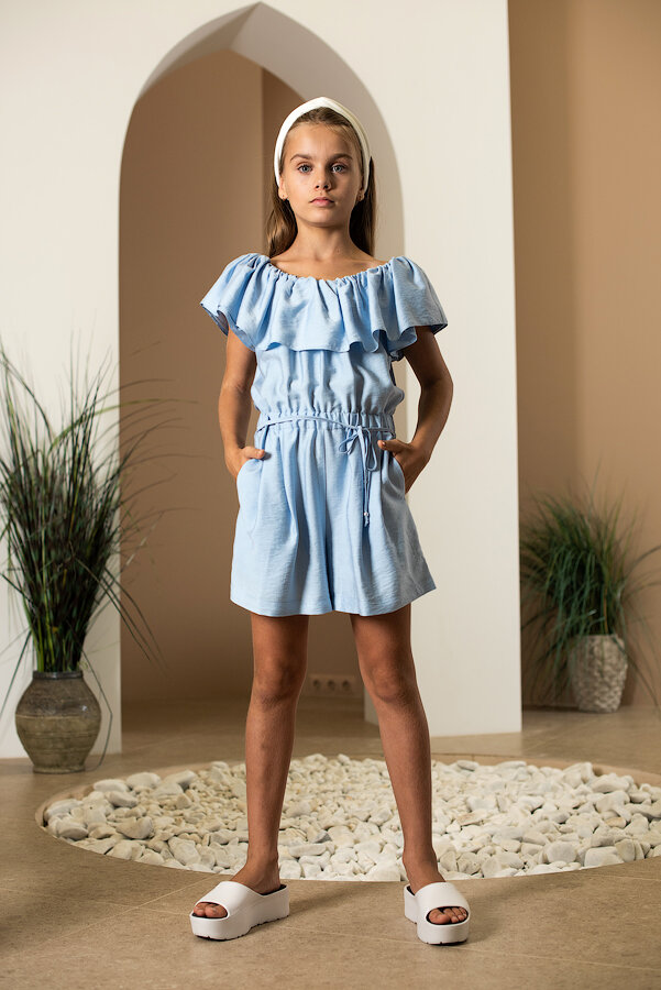 Комбинезон с шортами из струящейся вискозы, с объемным воланом по плечам.
