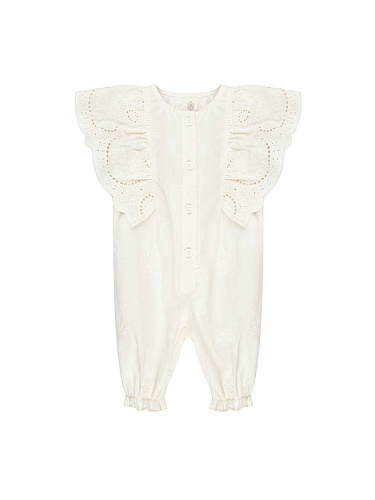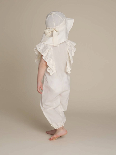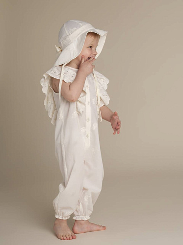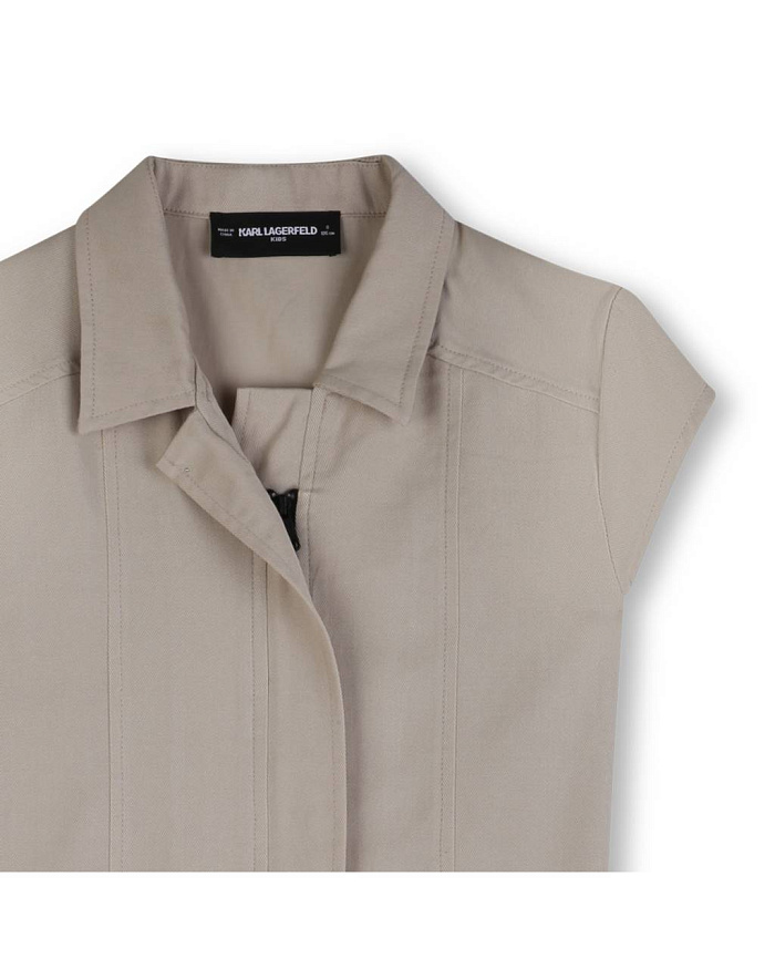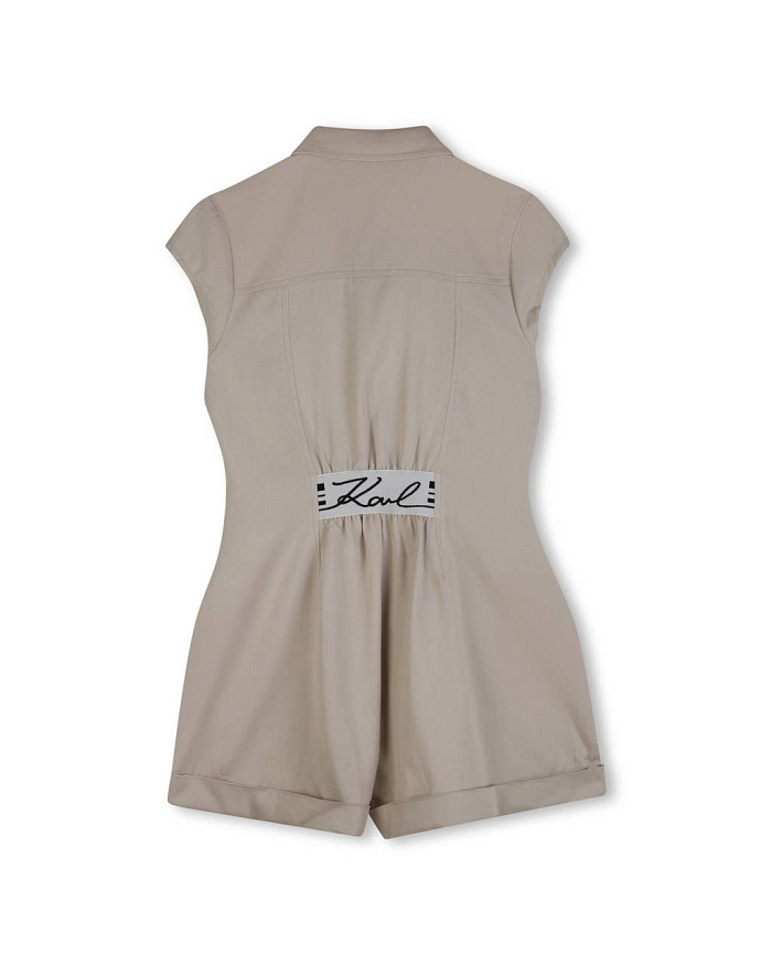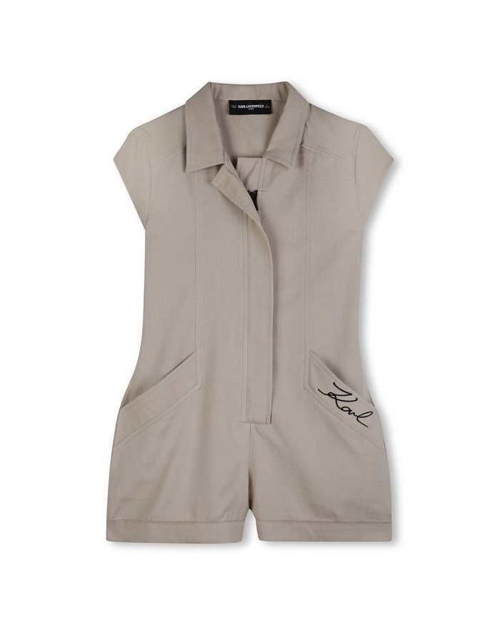 Комбинезон для девочки выполнен из легкого и приятного на ощупь материала, что обеспечивает комфорт в течение всего дня. Модель представлена в спокойном бежевом цвете, который легко сочетается с различными аксессуарами и другой одеждой. Классический отложной воротник придает образу аккуратность и стиль, а короткие рукава делают изделие удобным для теплого времени года. Передняя часть комбинезона закрывается на застежку, скрытую под планкой, что создает лаконичный внешний вид. По бокам расположены два вместительных накладных кармана, один из которых украшен вышивкой с надписью, добавляющей индивидуальности изделию. Прямой крой обеспечивает свободу движений, а аккуратные швы подчеркивают качество исполнения. Материал визуально плотный и устойчивый к износу, подходит для повседневной носки. Универсальный дизайн делает комбинезон для девочки отличным выбором для прогулок, поездок и активного отдыха.