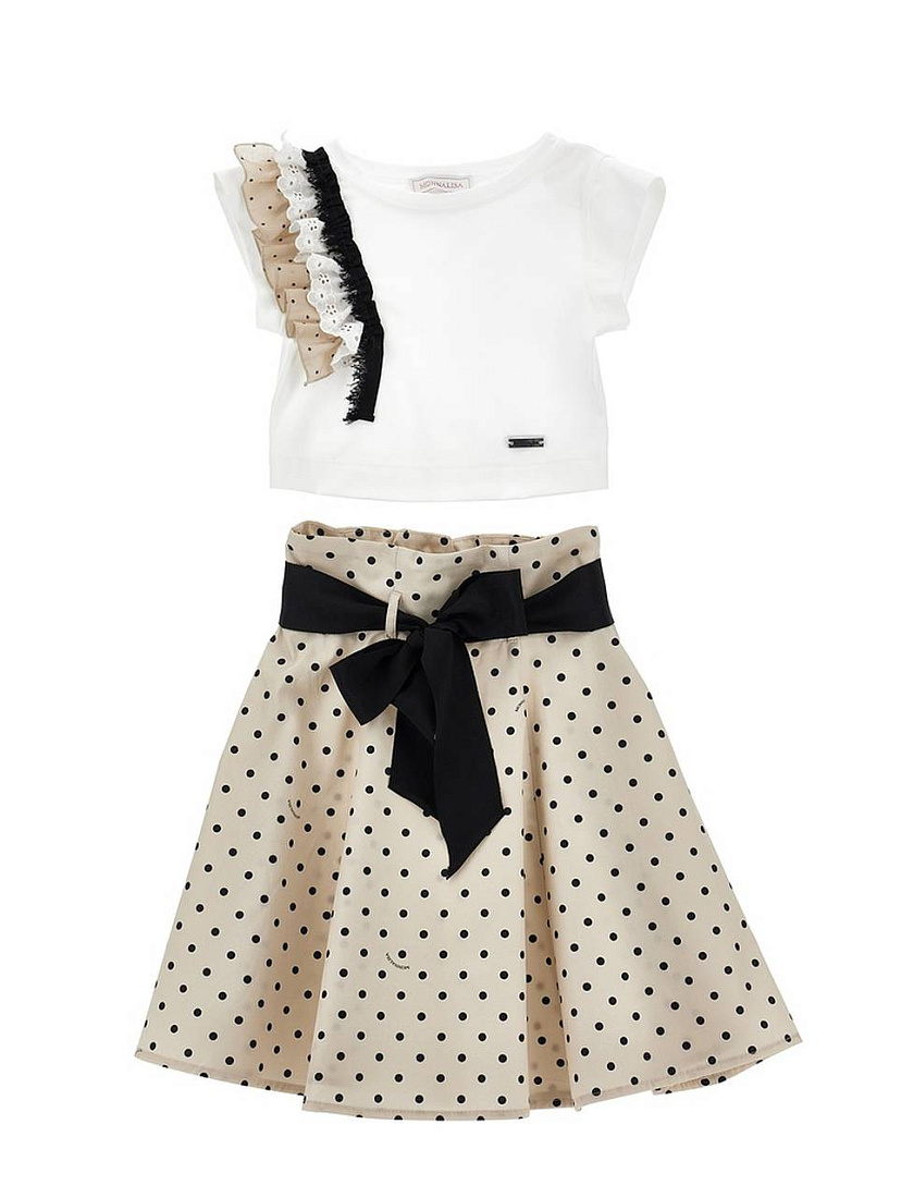 Комплект для девочки состоит из футболки и юбки, идеально подходящих для создания стильного образа. Футболка выполнена из мягкого хлопкового материала белого цвета, отличается короткими рукавами и оригинальным дизайнерским элементом — асимметричным декором из черного, бежевого и белого кружева с одной стороны. Этот акцент придает изделию элегантность и индивидуальность. Юбка для девочки выполнена из легкой ткани бежевого оттенка с классическим узором в черный горох, что создает яркий и модный контраст с верхом. На поясе юбки расположен широкий черный пояс, завязывающийся эффектным бантом спереди, что подчеркивает талию и добавляет образу нарядности. Крой юбки свободный, расклешенный, что обеспечивает удобство движений и привлекательный внешний вид. Такой комплект отлично подойдет для повседневной носки, прогулок и праздничных мероприятий.
