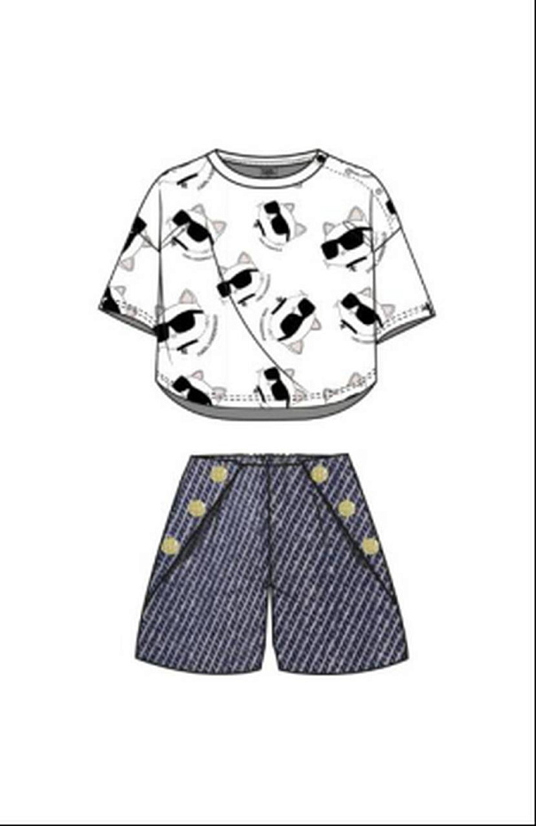 Футболка и шорты для девочки — это практичный и стильный вариант одежды, который отлично подойдет для повседневного использования и прогулок. Футболка выполнена в светлом оттенке с оригинальным принтом в виде котиков в солнечных очках, что придает образу игривость и индивидуальность. Прямой крой и короткие рукава обеспечивают свободу движений и комфорт даже в жаркую погоду. Круглый вырез горловины аккуратно обработан, материал визуально выглядит мягким и приятным на ощупь, что важно для нежной кожи ребенка. Шорты для девочки выполнены из материала, имитирующего джинсовую ткань, и украшены декоративными пуговицами по бокам, что добавляет интересный акцент в дизайн. Узор на шортах напоминает диагональную полоску, что визуально удлиняет ноги и создает модный образ. Эластичный пояс обеспечивает удобную посадку, а свободный крой не сковывает движения. Комплект хорошо сочетается между собой по стилю и цветовой гамме, делая его универсальным выбором для активного отдыха и прогулок.