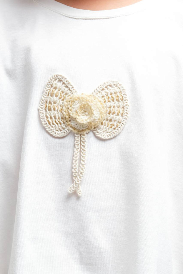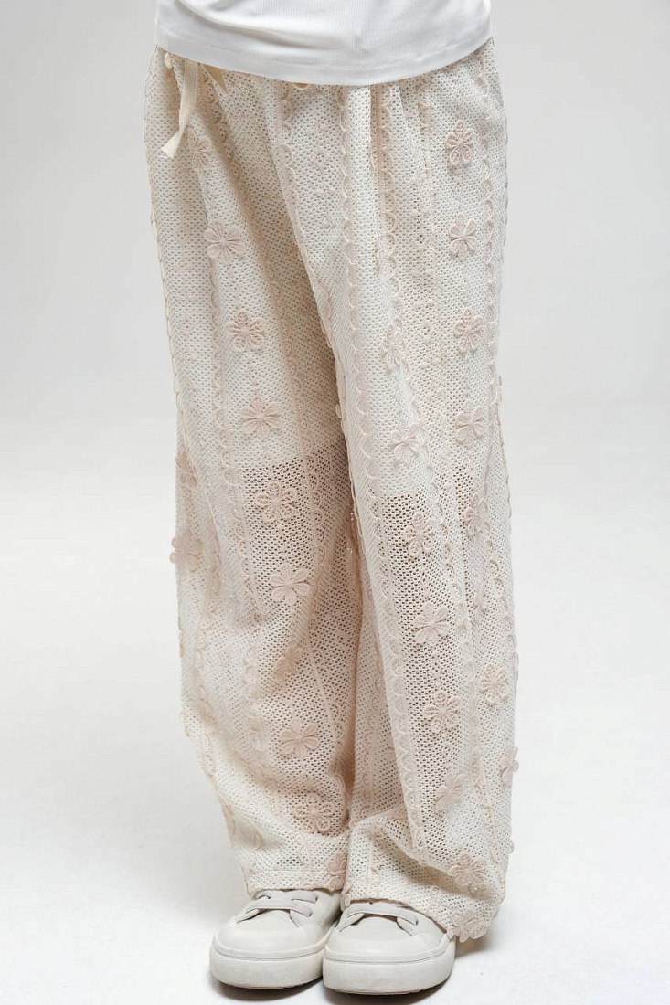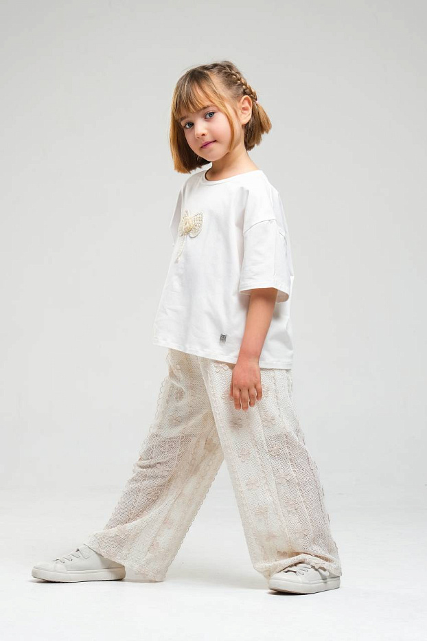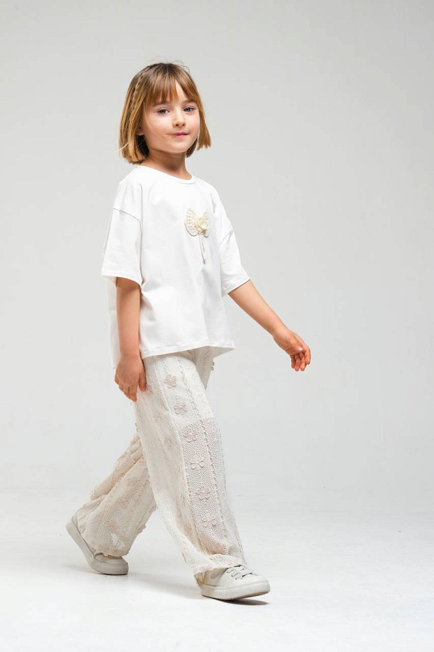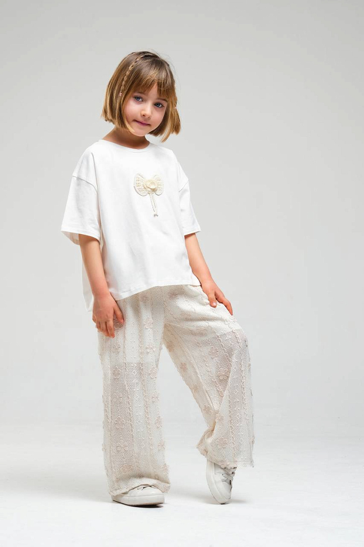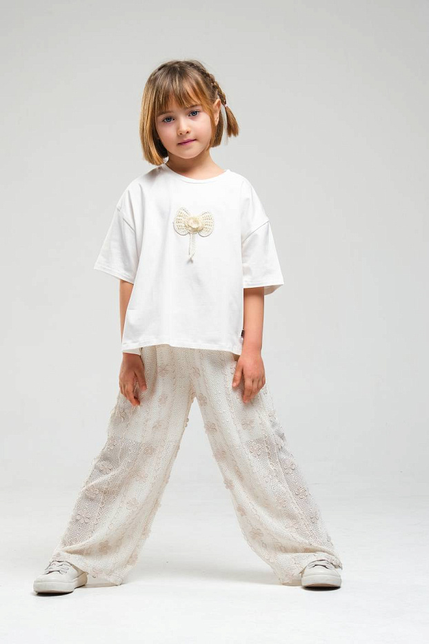 Костюм для девочки состоит из свободной белой футболки и широких светлых брюк с изящным кружевным узором. Верх выполнен из мягкого, приятного на ощупь материала, хорошо пропускающего воздух, что обеспечивает комфорт в течение всего дня. На футболке расположен декоративный элемент в виде объемного банта с подвеской, что добавляет образу нежности и оригинальности. Рукава короткие, свободного кроя, что не стесняет движений и подходит для активных прогулок или отдыха. Брюки для девочки имеют прямой силуэт и выполнены из легкой ткани с ажурной текстурой, украшенной аккуратным рисунком, что придает изделию утонченность и воздушность. Эластичный пояс обеспечивает удобную посадку и легко адаптируется под фигуру. Костюм для девочки идеально подходит для повседневной носки, посещения мероприятий или фотосессий. Цветовая гамма выполнена в спокойных светлых тонах, универсальных и легко сочетающихся с другой одеждой.