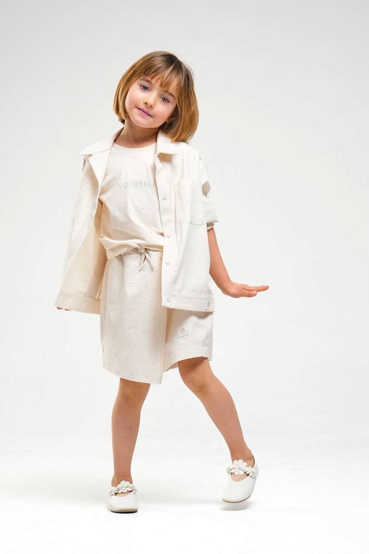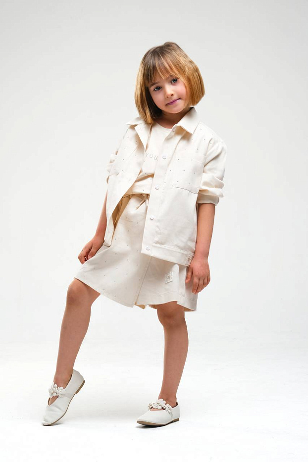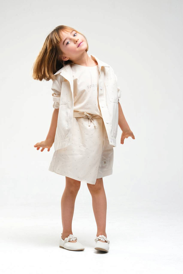 Костюм для девочки выполнен в светлом, нейтральном оттенке, который идеально подойдет для любого сезона и легко сочетается с другой одеждой. В комплект входит легкая куртка на кнопках с отложным воротником и длинными рукавами, которые можно подвернуть для более свободного стиля. Куртка имеет свободный крой, что обеспечивает комфорт и свободу движений. Под курткой надета базовая футболка без рисунка, выполненная из мягкого материала, приятного к телу и не вызывающего раздражения. Юбка на резинке с завязкой по талии дополнена небольшим поясом, что позволяет регулировать посадку и обеспечивает дополнительное удобство. Материал костюма выглядит плотным, но при этом легким и дышащим, что делает его подходящим для прогулок и активных игр. Отсутствие ярких принтов и декора подчеркивает минималистичный стиль и современный дизайн. Такой костюм для девочки подходит как для повседневной носки, так и для особых случаев, благодаря универсальному фасону и цвету.