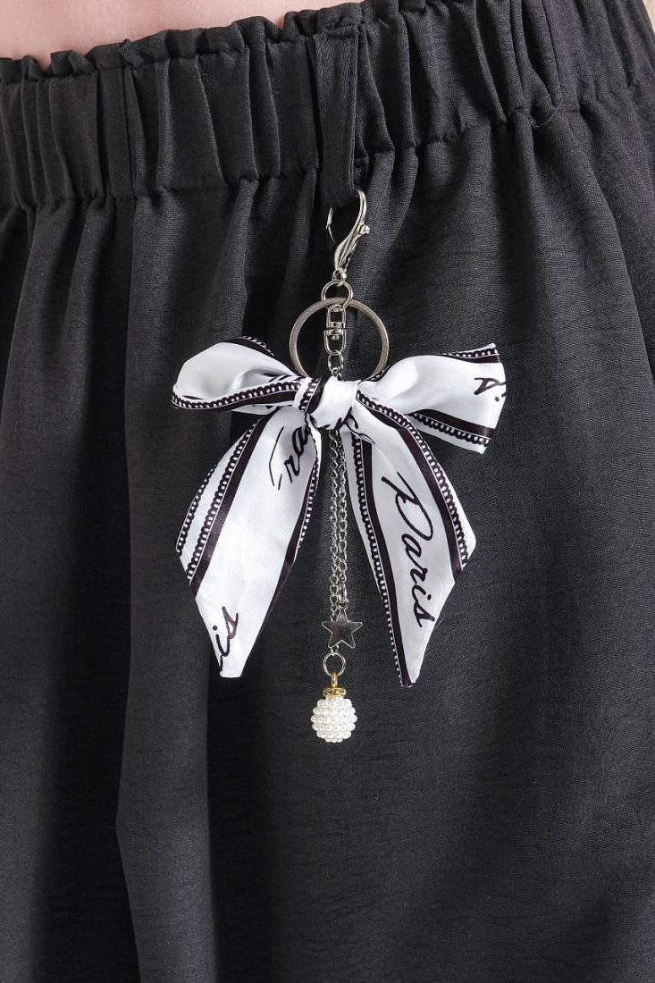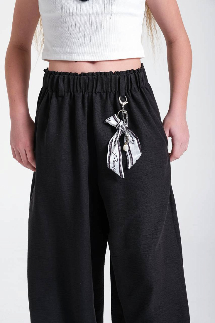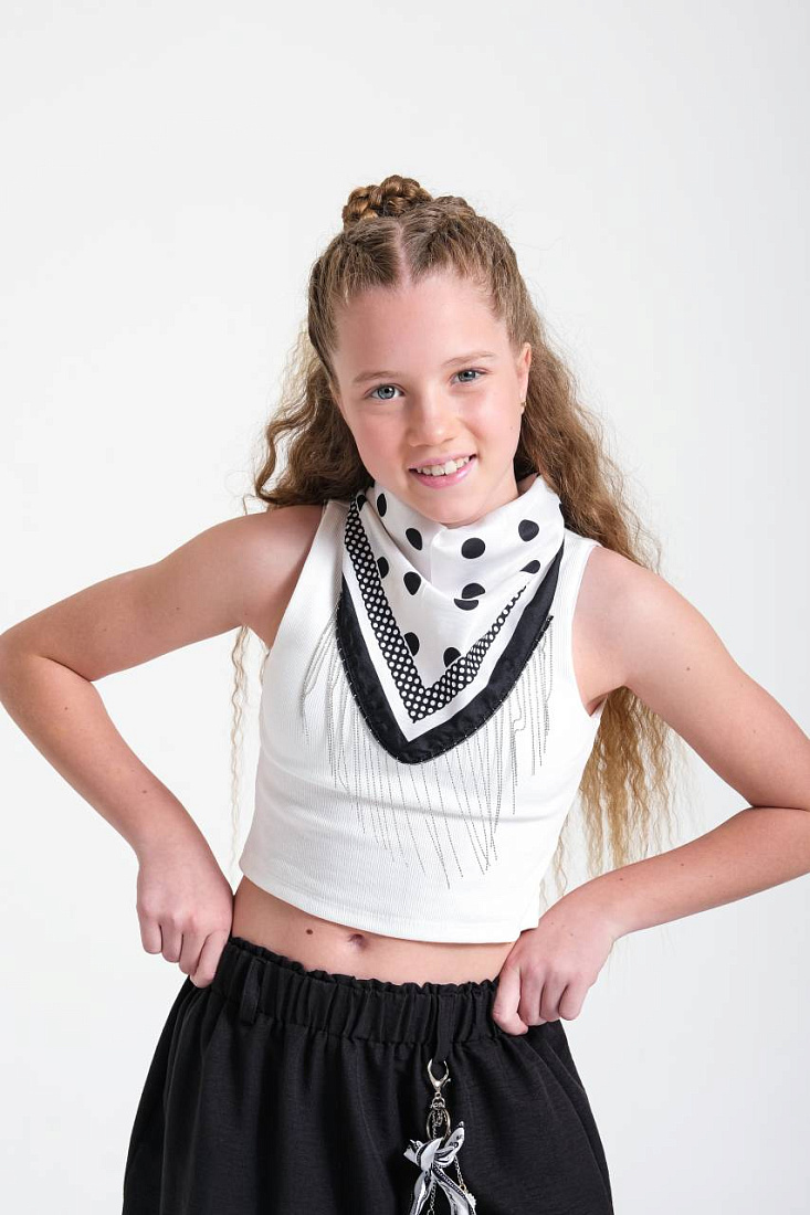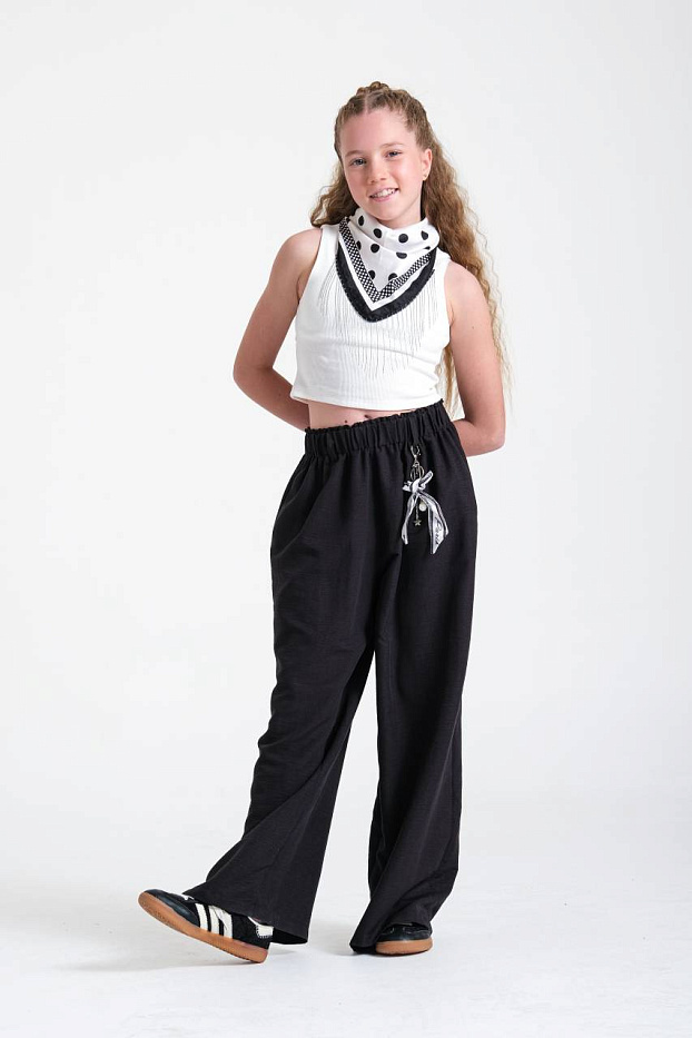 Костюм для девочки выполнен в современном стиле, сочетая удобство и оригинальность. Верх костюма — укороченный топ белого цвета на широких бретелях, с фактурной вязкой, что обеспечивает комфорт и легкость в носке. Топ украшен стильным многоуровневым воротником с черно-белым рисунком и декоративными элементами, что придает образу индивидуальность и динамику. Низ костюма представлен свободными черными брюками с эластичным поясом, что обеспечивает отличную посадку и не стесняет движения. Брюки декорированы контрастным платком, аккуратно завязанным на поясе, добавляя оригинальный акцент и завершенность стилю. Материал костюма визуально выглядит легким и дышащим, что делает его подходящим для активных занятий и повседневной носки. Брюки имеют удобные карманы, что добавляет практичности и функциональности. Широкий крой брюк создает модный силуэт и подчеркивает актуальность дизайна. Костюм для девочки отлично подойдет для прогулок, творческих занятий и любых активностей.