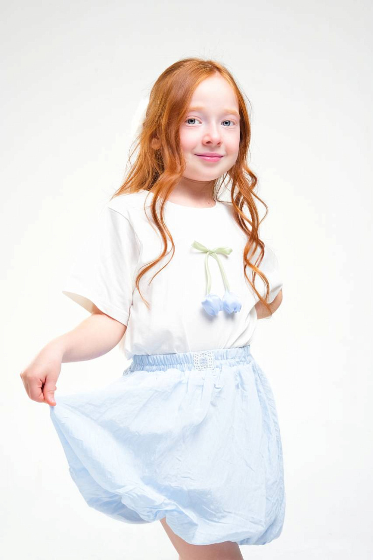 Костюм для девочки состоит из двух предметов: футболки и юбки. Верх выполнен из легкой ткани с короткими рукавами и свободным кроем, что обеспечивает комфорт при движении. На футболке присутствует вышивка в виде двух вишен с декоративными объемными элементами, что добавляет образу индивидуальность и делает его интересным для ребенка. Юбка голубого оттенка с воздушной текстурой, визуально напоминает баллон благодаря присборенной резинке по низу и поясу. Материал юбки легкий, хорошо держит форму и придает изделию объем, что особенно удобно для активных игр. Весь костюм для девочки отлично подходит как для прогулок, так и для праздников или фотосессий. Приятные к телу материалы, простота ухода и износостойкость обеспечивают долговечность комплекта. Эластичная резинка на поясе юбки гарантирует идеальную посадку и удобство при надевании. Мягкие оттенки делают образ нежным и современным, а оригинальный декор на футболке подчеркивает индивидуальность ребенка.