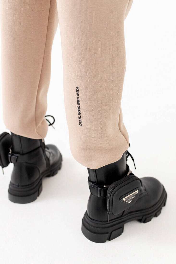 На задней половине брюк также текстовый принт.