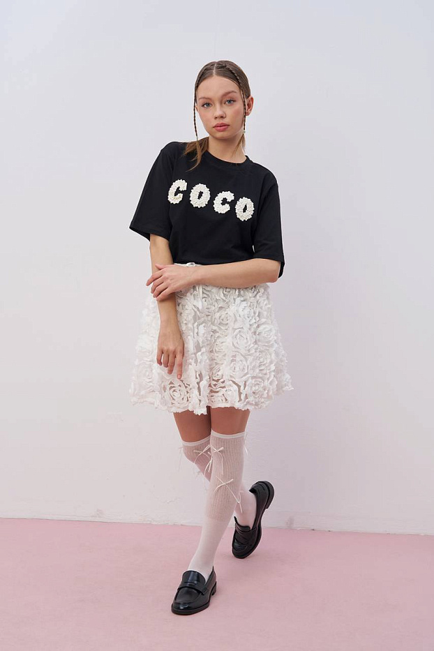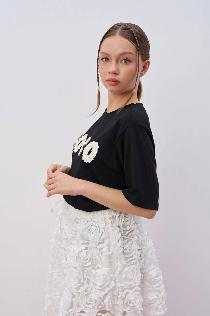 Черная футболка с цветочками цвета экрю идеально подходит для девочки и прекрасно сочетается с юбкой цвета экрю. Такой комплект создает стильный и аккуратный образ, удобный для повседневной носки. Футболка выполнена из качественного материала, который обеспечивает комфорт и хорошую воздухопроницаемость.Цветочки на черном фоне добавляют изящества и легкости образу. Юбка цвета экрю дополнит наряд и сделает его универсальным для разных мероприятий. Этот вариант одежды отлично подойдет для прогулок и уроков, даря свободу движений и приятные тактильные ощущения. Лаконичный дизайн и гармоничное сочетание оттенков позволяют легко подобрать обувь и аксессуары. Комплект создан с учетом потребностей активных девочек, ценящих удобство и стиль.