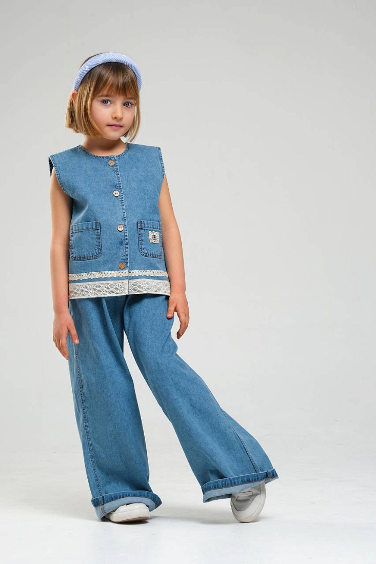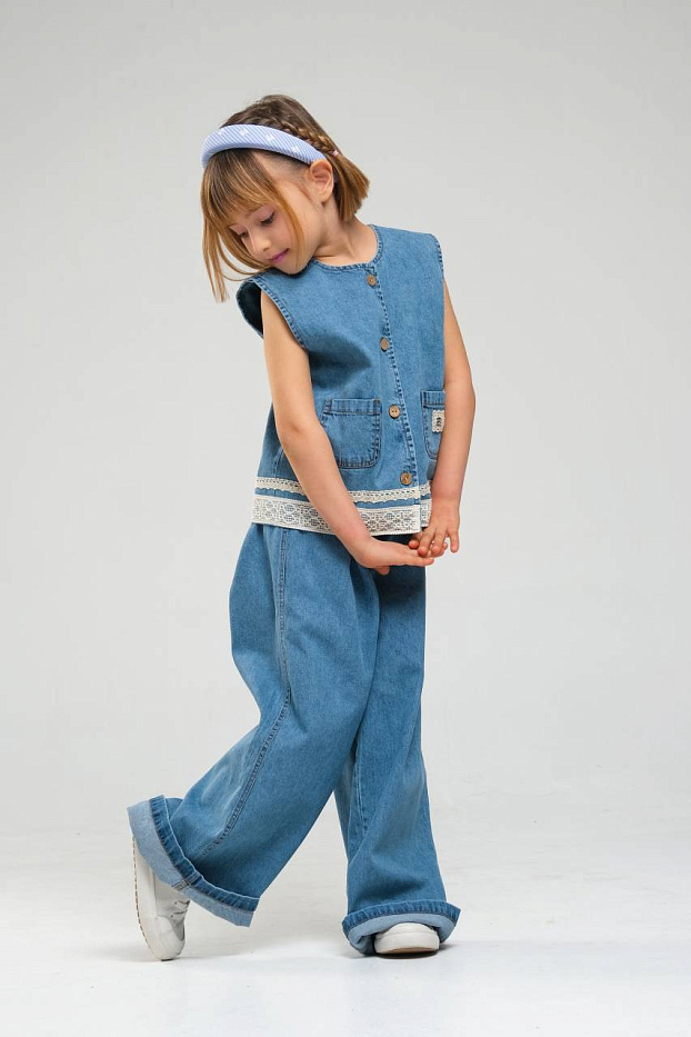 Костюм для девочки выполнен из плотного денима приятного голубого цвета, который отлично подходит для повседневной носки. Верхняя часть комплекта — это жилет без рукавов на пуговицах, декорированный накладными карманами и аккуратной декоративной отделкой по низу в виде кружевной ленты. Дизайн жилета лаконичен, но стильные детали придают ему современный вид. Низ костюма представлен свободными широкими джинсовыми брюками с отворотами, которые обеспечивают комфорт и не сковывают движений. Брюки выполнены в том же цвете, что и жилет, что создает гармоничный и завершенный образ для девочки. Материал костюма отличается износостойкостью и сохраняет форму после стирки. На карманах есть небольшие декоративные нашивки, добавляющие индивидуальности и оригинальности внешнему виду. Костюм отлично сочетается с разной обувью и аксессуарами, легко комбинируется с футболками или водолазками в прохладную погоду.