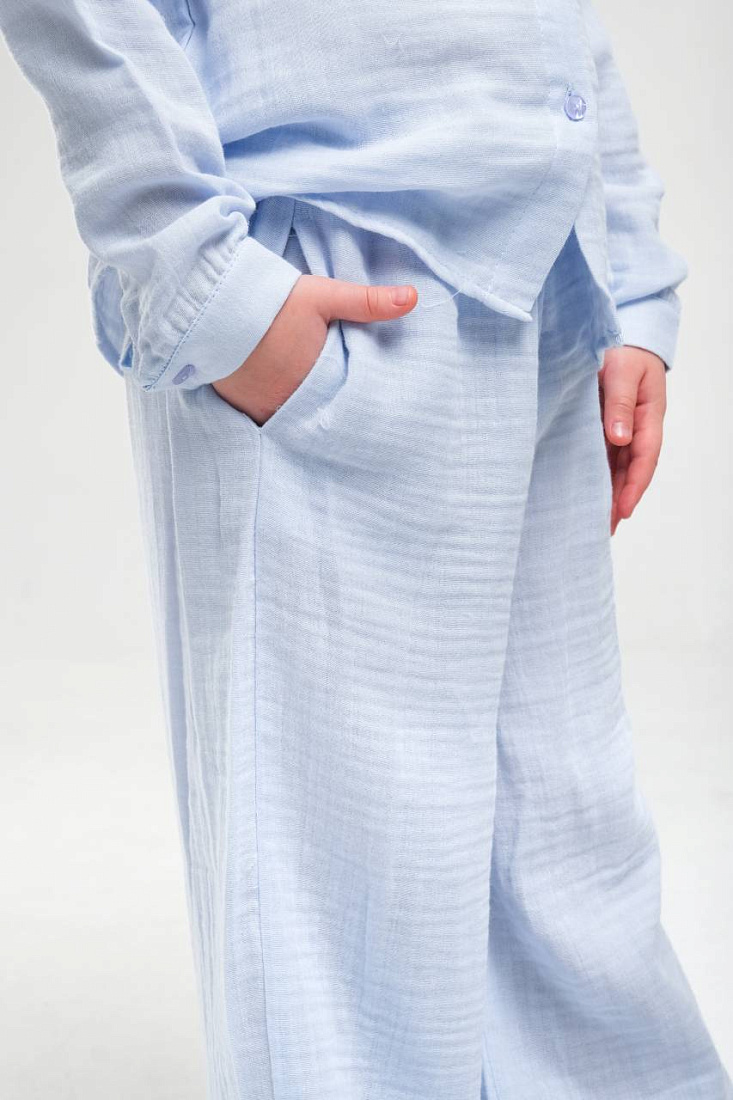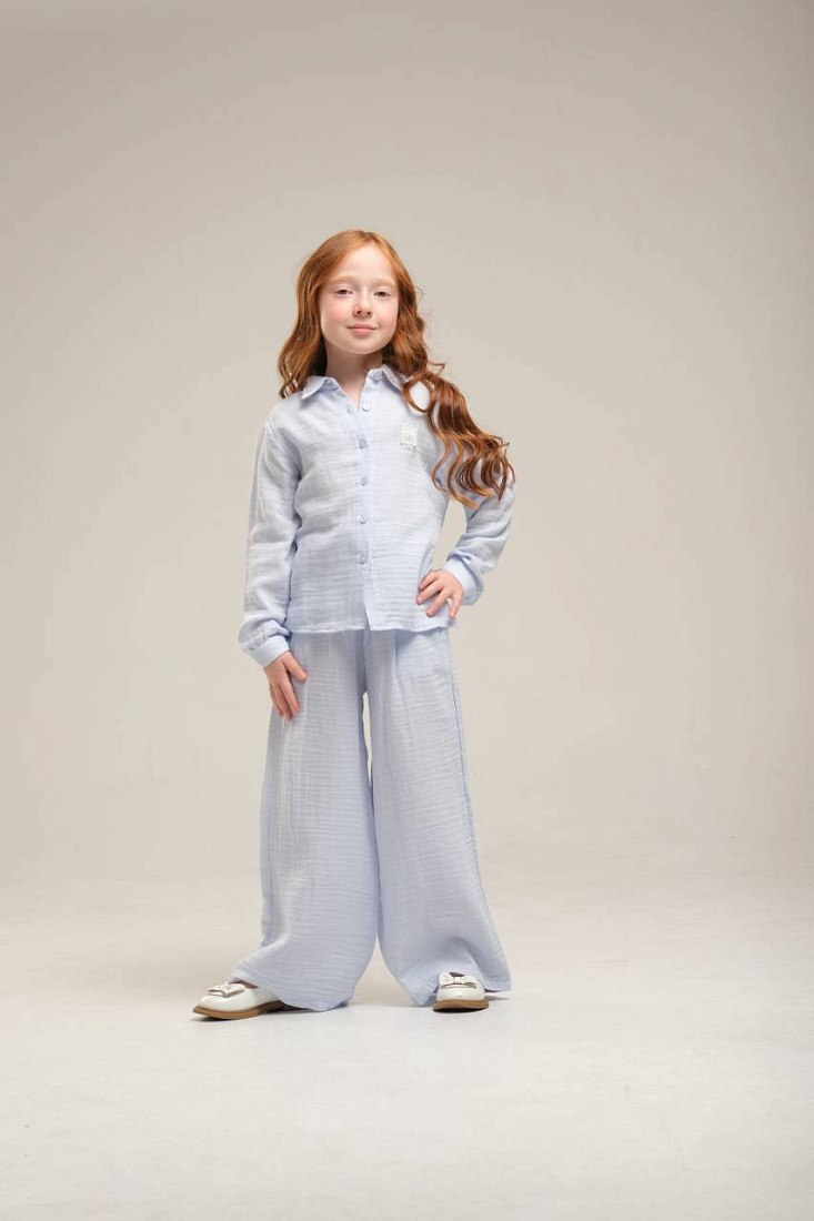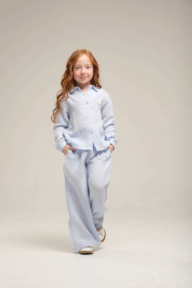 Костюм для девочки выполнен из мягкой и приятной на ощупь ткани с выраженной текстурой. Модель включает в себя рубашку с длинными рукавами и прямыми широкими манжетами, а также свободные брюки на удобной посадке. Светлый пастельный оттенок костюма придает образу легкость и свежесть, отлично подходит для повседневной носки и создает ощущение уюта. Рубашка застегивается на пуговицы по всей длине, что обеспечивает легкость надевания и позволяет регулировать посадку. Классический отложной воротник делает образ универсальным и аккуратным, а свободный крой не сковывает движений, что особенно важно для активной девочки. Брюки дополнены эластичным поясом, который обеспечивает комфортную посадку и удерживает изделие на месте в течение всего дня. Приятная к телу ткань позволяет носить костюм как дома, так и на прогулке или в гостях. Минималистичный дизайн без лишних деталей делает костюм стильным и современным, а аккуратная строчка подчеркивает качество пошива.