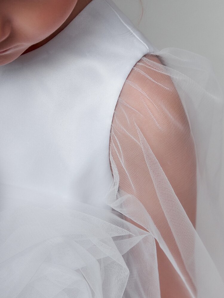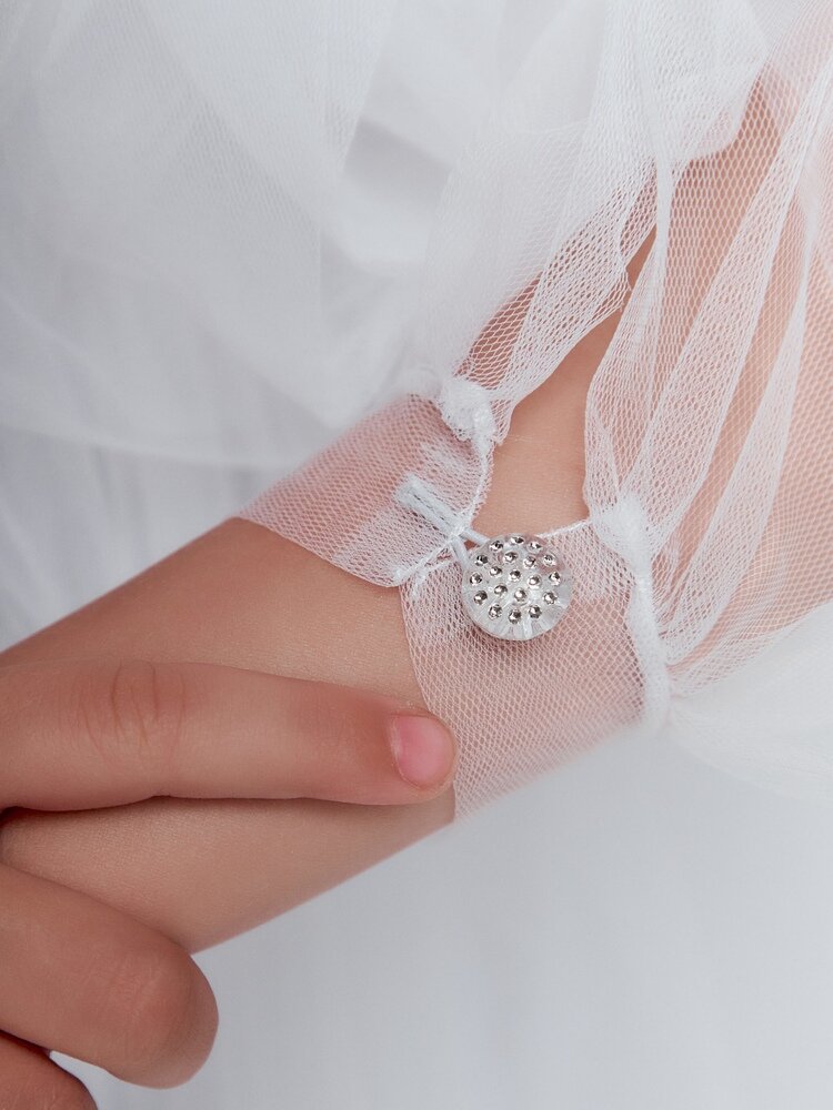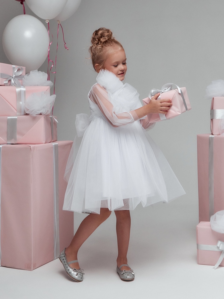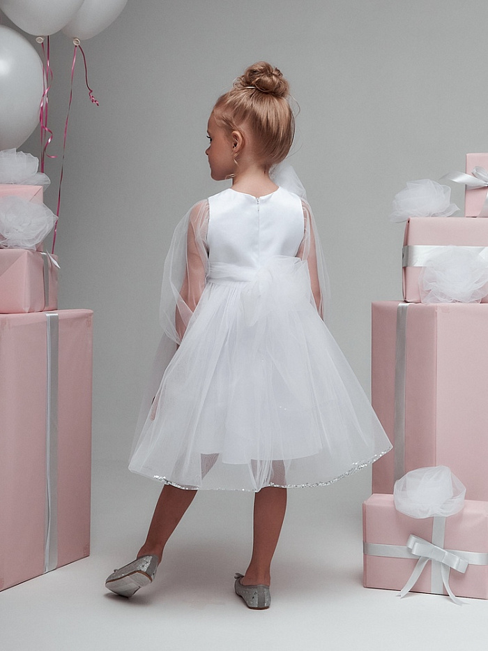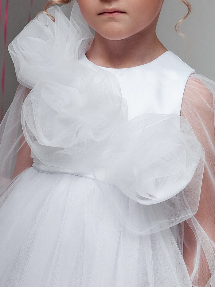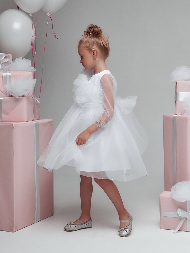 Представляем вам привлекающее внимание нарядное платье для маленьких принцесс, которое станет незаменимым элементом гардероба для особых случаев. Широкие прозрачные длинные рукава придают образу легкость и элегантность, позволяя девочке чувствовать себя комфортно и свободно. На груди расположено оригинальное украшение из цветов ручной работы, добавляющее платью изюминку и уникальность. Каждое платье украшено индивидуально, что делает его поистине эксклюзивным. Очень пышная и воздушная юбка дарит маленьким принцессам возможность двигаться и танцевать с радостью, создавая волшебный образ. В низ юбки насыпаны серебристые пайетки, которые свободно пересыпаются внутри и создают сказочный волшебный эффект.