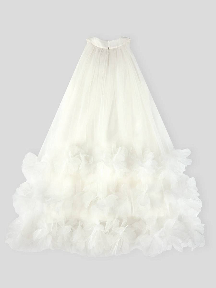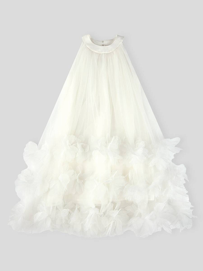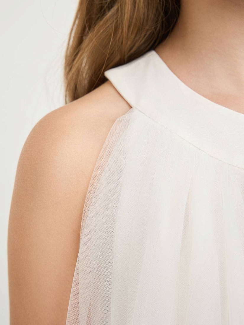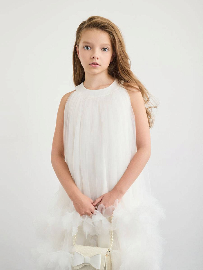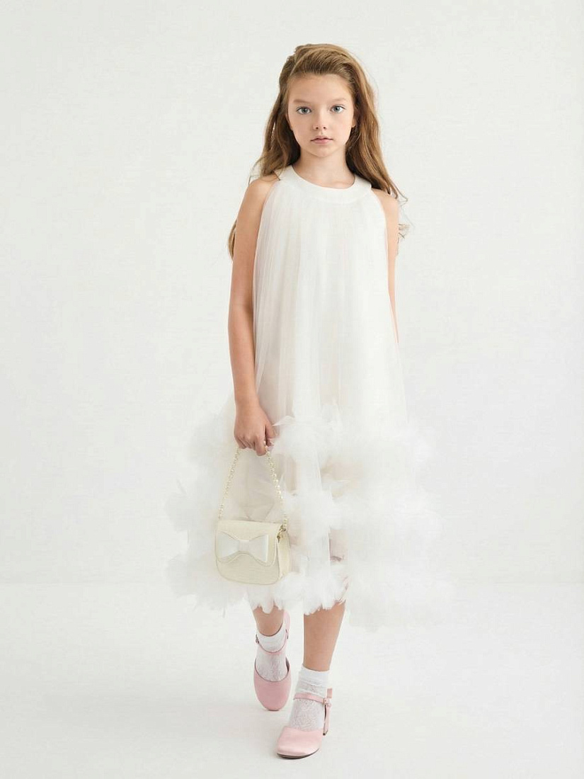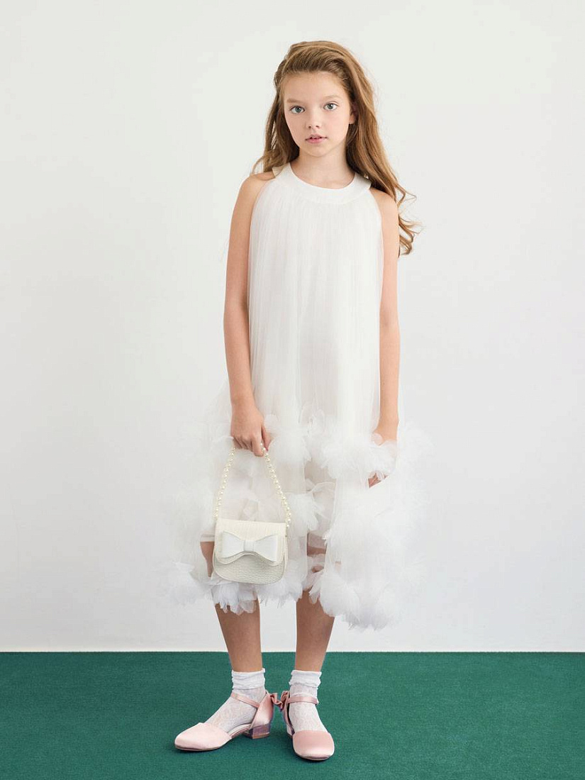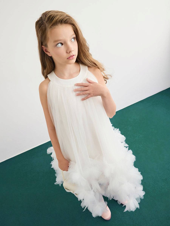 Платье для девочки выполнено в нежном светлом оттенке, что придает образу утонченность и легкость. Материал визуально напоминает воздушный тюль, который красиво струится и мягко драпируется. Основная часть изделия имеет свободный крой, что обеспечивает комфорт и свободу движений. Дизайн платья отличается оригинальной отделкой по нижнему краю: многослойные объемные рюши создают эффект пушистых облаков и добавляют изделию праздничный характер. Округлый вырез горловины аккуратно оформлен, без лишних деталей, что делает акцент на лаконичности верха. Отсутствие рукавов подчеркивает легкость конструкции и подходит для торжественных случаев или летнего сезона. Текстура материала гладкая и приятная на ощупь, а визуально ткань выглядит невесомой. На фото видно, что платье для девочки легко комбинируется с аксессуарами, например, сумочкой и туфлями, что позволяет создавать завершенный нарядный образ. Такой фасон отлично подойдет для особых мероприятий, фотосессий или праздников.