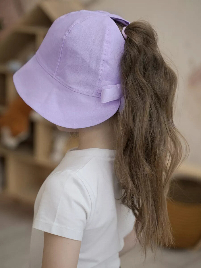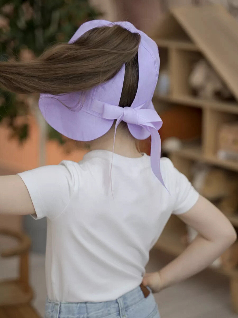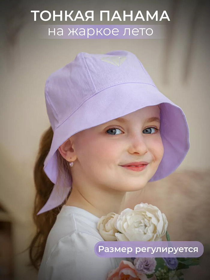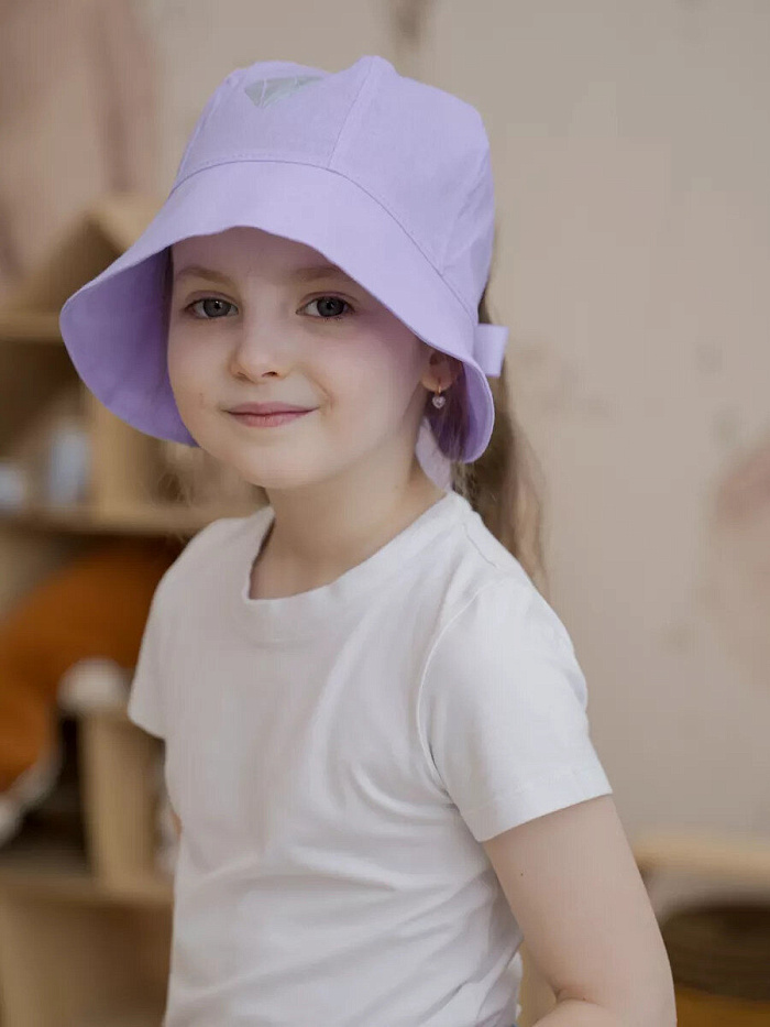 Легкая однослойная панама для девочек. Головной убор декорирован термотрансфером .Красивый бант сзади не только создаёт романтический образ, но и служит регулировкой размера. Панама укроет голову во время жары, а её поля защитят глаза ребенка от яркого солнца .
