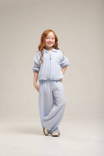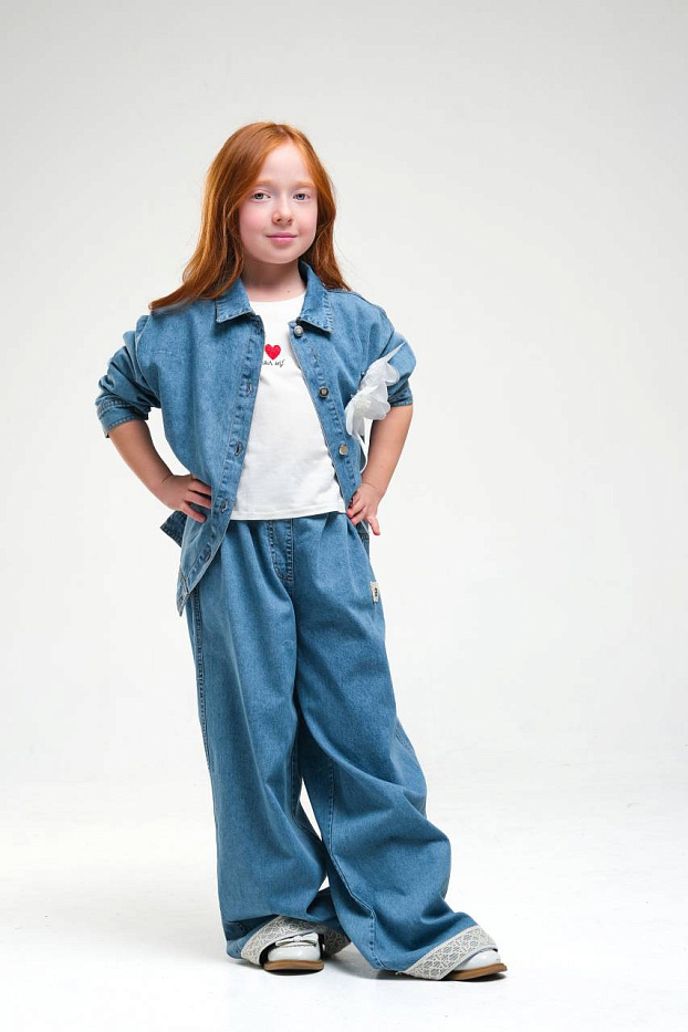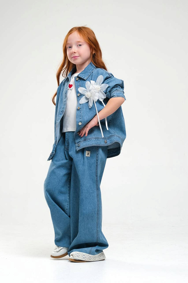 Джинсовый пиджак для девочки выполнен из плотного денима, который хорошо держит форму и обеспечивает комфорт в повседневной носке. Классический синий цвет делает изделие универсальным и стильным. Модель имеет свободный крой, что позволяет легко сочетать пиджак с различной одеждой, а также обеспечивает свободу движений для активных детей. Застежка на пуговицы по всей длине изделия позволяет быстро и удобно снимать и надевать пиджак. На груди находится декоративная крупная брошь в виде белого цветка, которая добавляет яркий акцент и делает образ более нарядным и оригинальным. Манжеты рукавов выполнены с возможностью подворота, что придает изделию дополнительную практичность и современный вид. Джинсовый материал отличается износостойкостью, подходит для частой носки и легко очищается. Пиджак для девочки подходит для прогулок, учебы и активного отдыха, гармонично сочетается с джинсами, брюками и юбками.