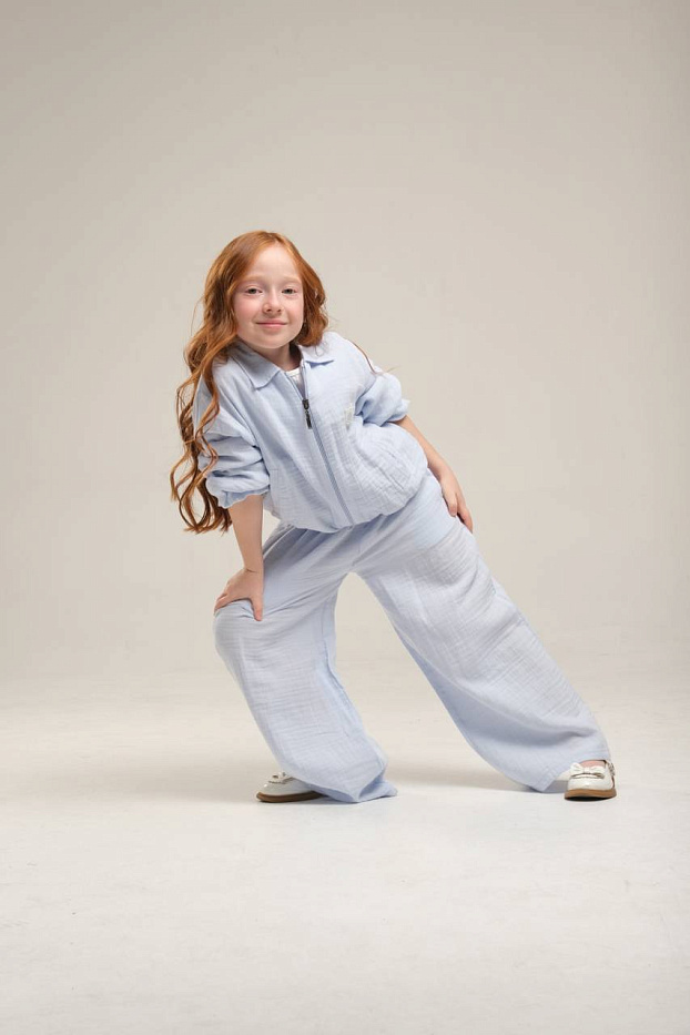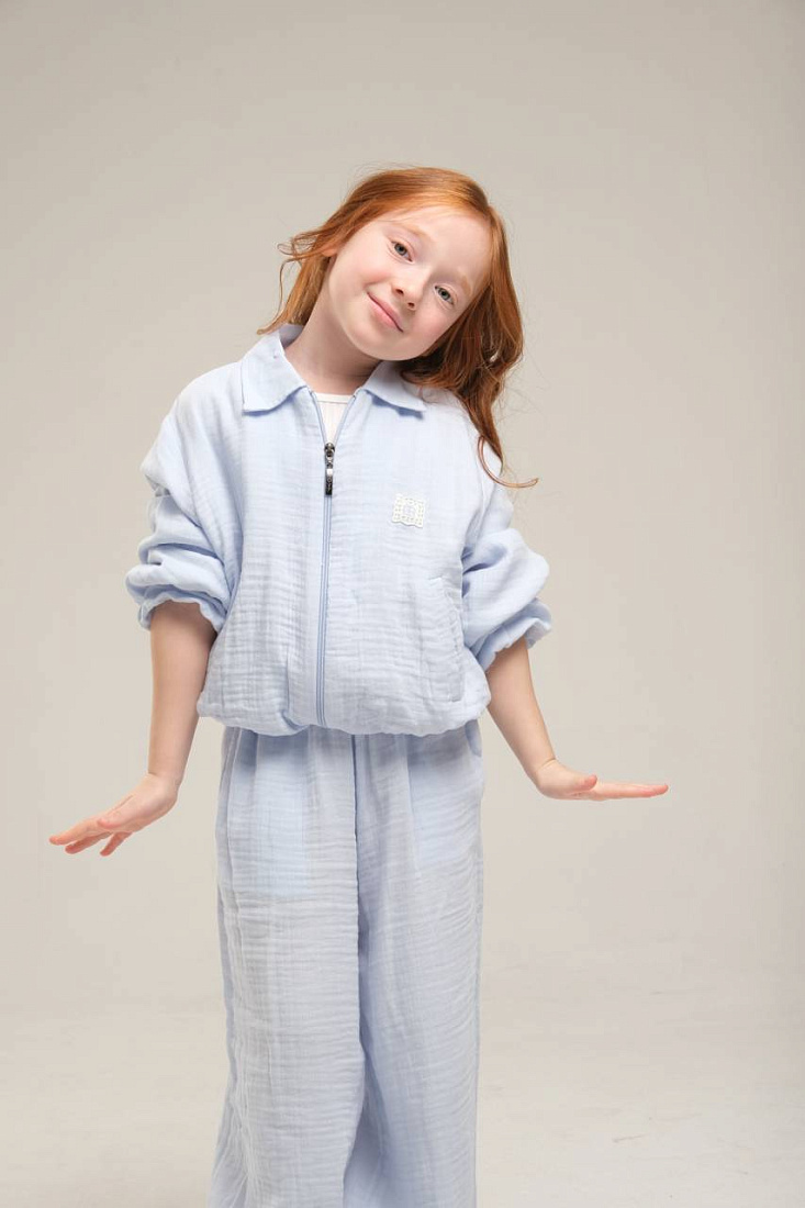 Легкий пиджак для девочки выполнен из мягкой ткани с заметной структурой, что обеспечивает комфорт и приятные тактильные ощущения. Светлый голубой цвет изделия универсален и отлично подойдет для повседневных и праздничных образов. Пиджак имеет свободный крой, который не сковывает движения, позволяя ребенку чувствовать себя уверенно и удобно. Воротник классической формы добавляет аккуратности и завершенности внешнему виду, а застежка-молния по центру облегчает процесс надевания и снимает изделие быстро и просто. Длинные рукава можно носить как в классическом варианте, так и немного подвернуть для более непринужденного стиля. Ткань визуально напоминает муслин — она хорошо пропускает воздух и подходит для носки в теплое время года. На груди расположен небольшой лаконичный декоративный элемент, что добавляет индивидуальности и интереса внешнему виду пиджака для девочки. Эластичная резинка по низу изделия помогает пиджаку хорошо держать форму и удобно садиться по фигуре.