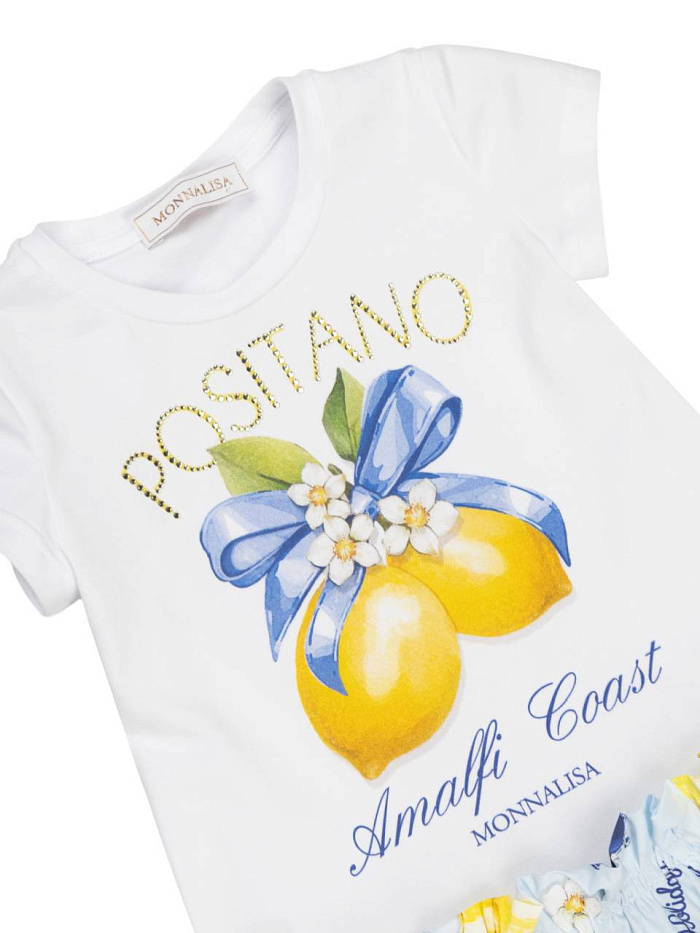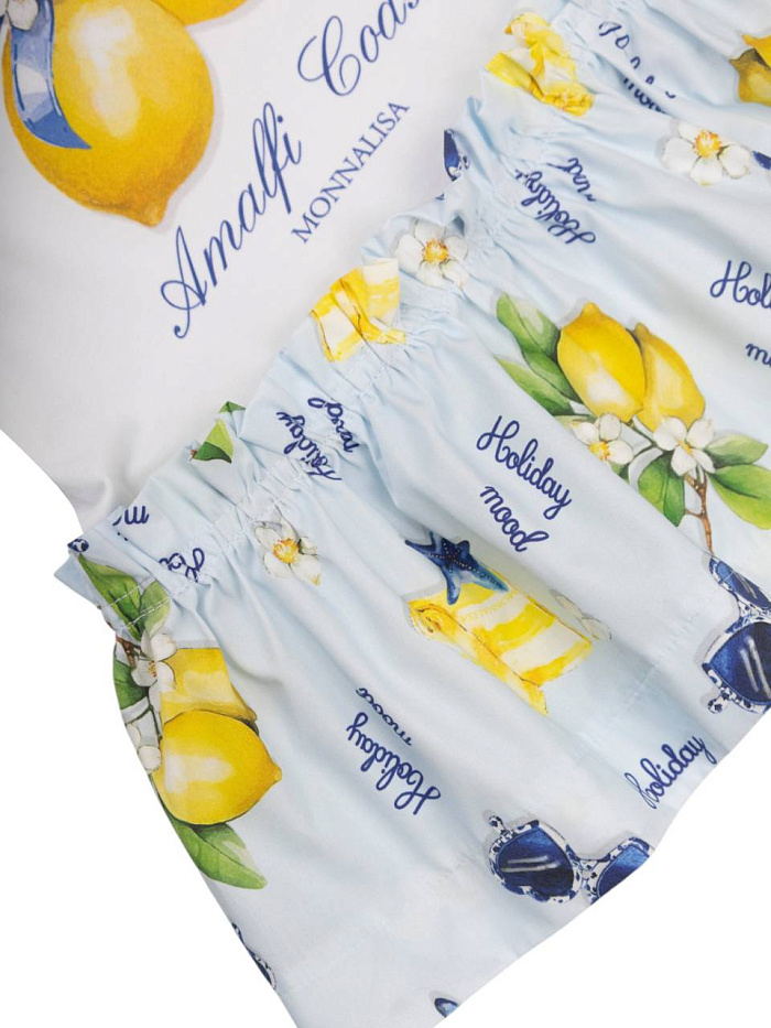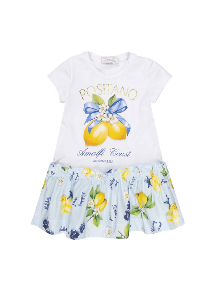 Платье для девочки выполнено в нежном и ярком стиле, который идеально подойдет для летних прогулок и праздничных мероприятий. Верх изделия имеет белую основу с крупным цветным принтом лимонов, украшенных синим бантом и цветами, что придает образу свежесть и жизнерадостность. На груди размещена декоративная надпись, гармонично дополняющая дизайн. Короткие рукава и круглый вырез обеспечивают комфорт в носке и свободу движений. Юбка платья для девочки отличается воздушным и легким фасоном, украшена тематическим лимонным принтом на голубом фоне, что подчеркивает летнее настроение и делает образ по-настоящему ярким. Материал платья выглядит мягким и приятным на ощупь, что важно для комфорта ребенка в течение всего дня. Эластичная талия обеспечивает удобную посадку и не сковывает движения. Стильное сочетание белого верха и голубой юбки с лимонным рисунком делает это платье для девочки привлекательным выбором как для повседневной носки, так и для особых случаев.