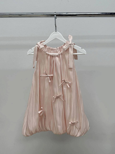 Платье для девочки выполнено из мягкого и приятного на ощупь материала, что обеспечивает комфорт в течение всего дня. Модель имеет короткие рукава и круглый вырез, что делает изделие универсальным для ежедневной носки и особых случаев. Основной цвет — нежный белый, который прекрасно сочетается с декоративными элементами. На груди расположена изящная аппликация в виде розового банта с гороховым принтом и цветочком, придающая образу легкость и утонченность. Юбка платья оформлена плавным переходом цвета от белого к светло-бежевому, украшена деликатным цветочным рисунком и мелкими горошинами, что создает ощущение воздушности и нежности. Классический крой платья обеспечивает свободу движений, а застежка на пуговицу на спинке облегчает процесс переодевания. Дизайн изделия подчеркивает индивидуальность и стиль, делая его отличным выбором для праздников, фотосессий или повседневной носки.