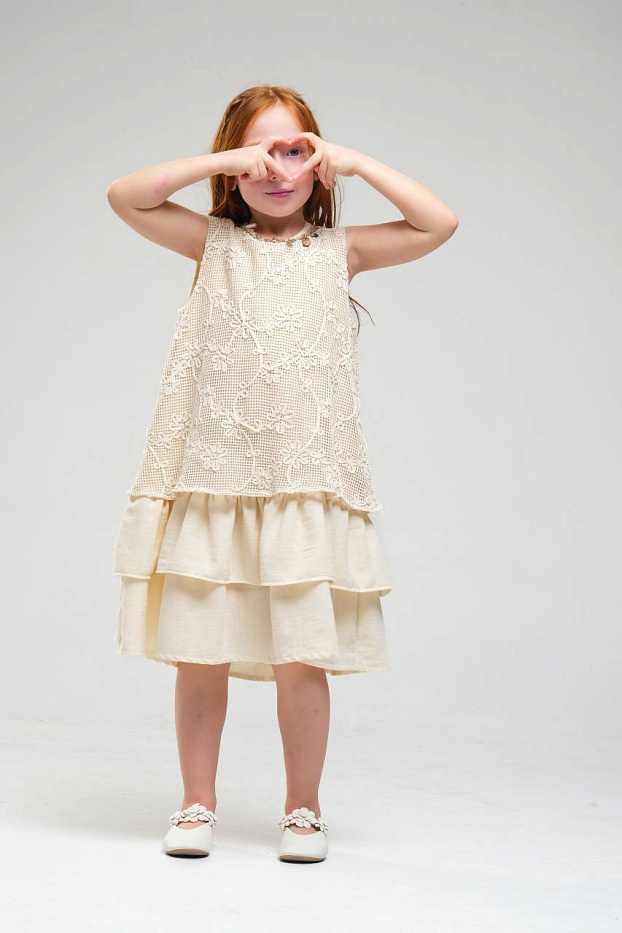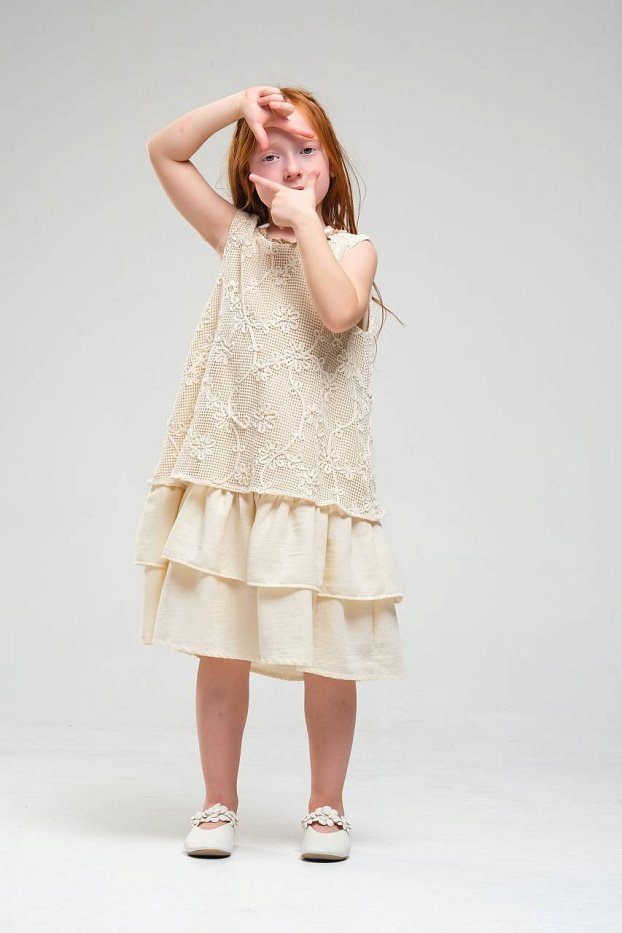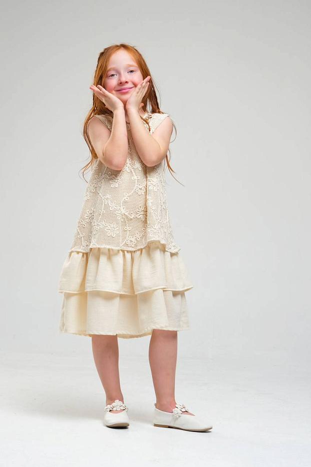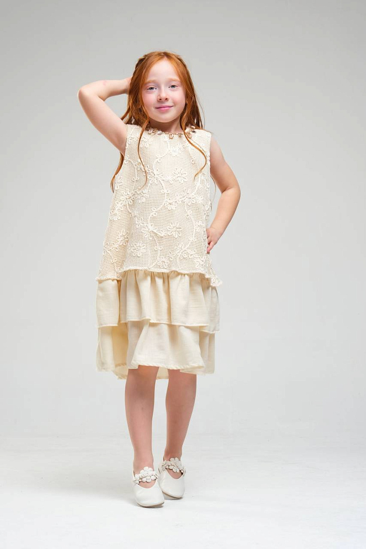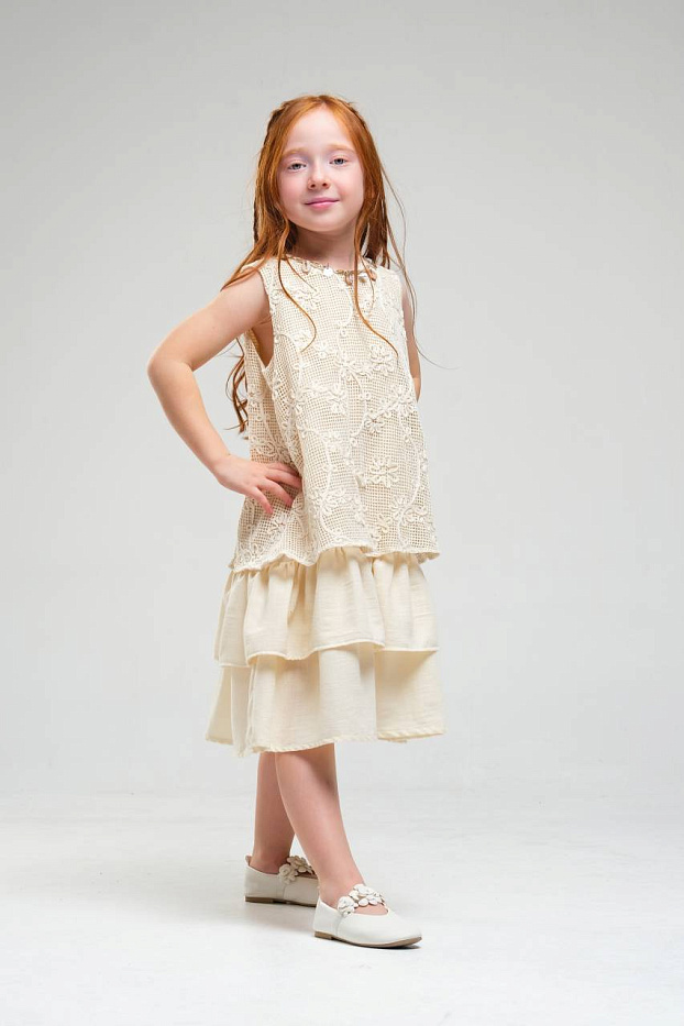 Платье для девочки выполнено в нежном светлом оттенке, что делает его универсальным выбором для различных торжественных случаев и праздников. Верхняя часть изделия украшена изящным кружевным узором с цветочным мотивом, что придает наряду романтичный и элегантный вид. Кружево отличается сложной текстурой, создающей эффект объема и утонченности. Низ изделия выполнен из легкой струящейся ткани, оформленной в виде двух ярусов, что придает платью воздушность и динамику при движении. Ярусная конструкция позволяет сохранить свободный крой, обеспечивая комфорт и удобство для активной девочки. Безрукавный фасон и круглый вырез горловины подчеркивают лаконичность дизайна и делают платье подходящим для теплого времени года. Мягкая внутренняя подкладка обеспечивает приятные ощущения на теле и предотвращает раздражение даже при длительном ношении. Материал внешнего слоя приятен на ощупь, хорошо держит форму и отличается износостойкостью.