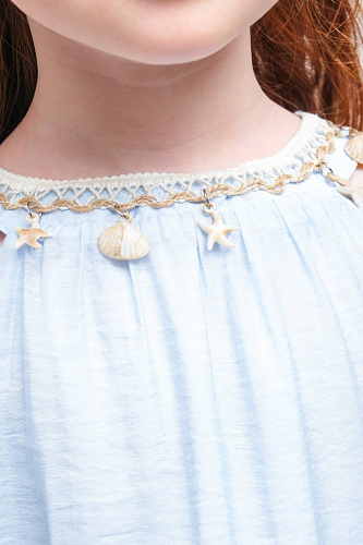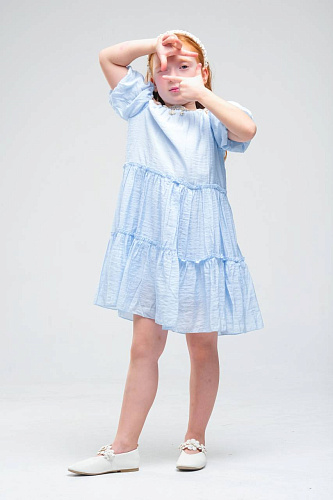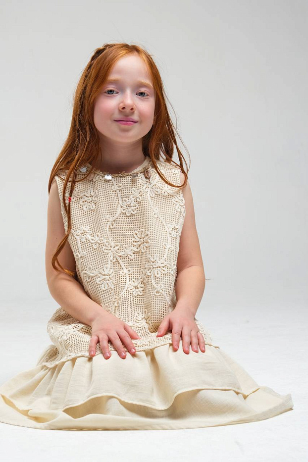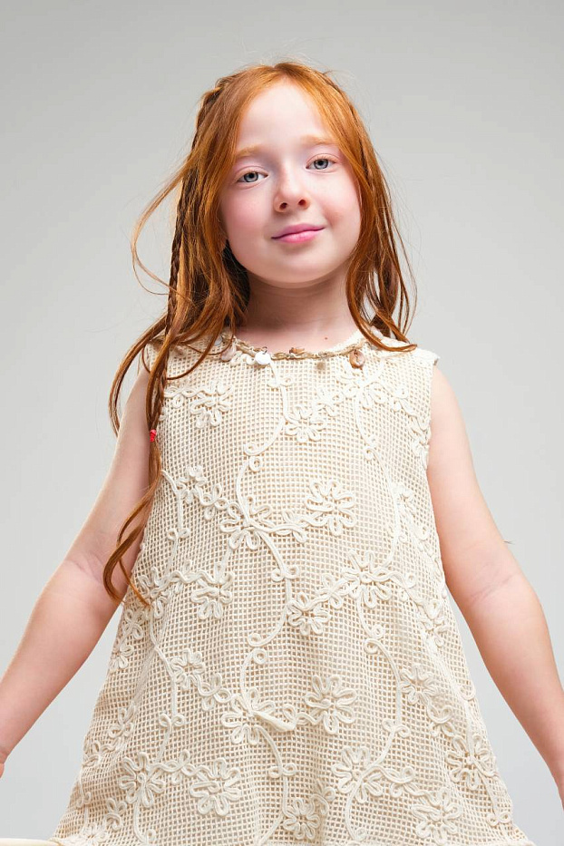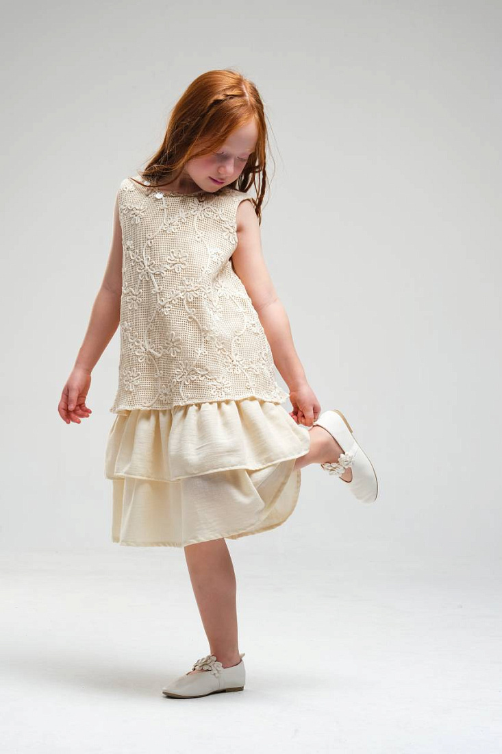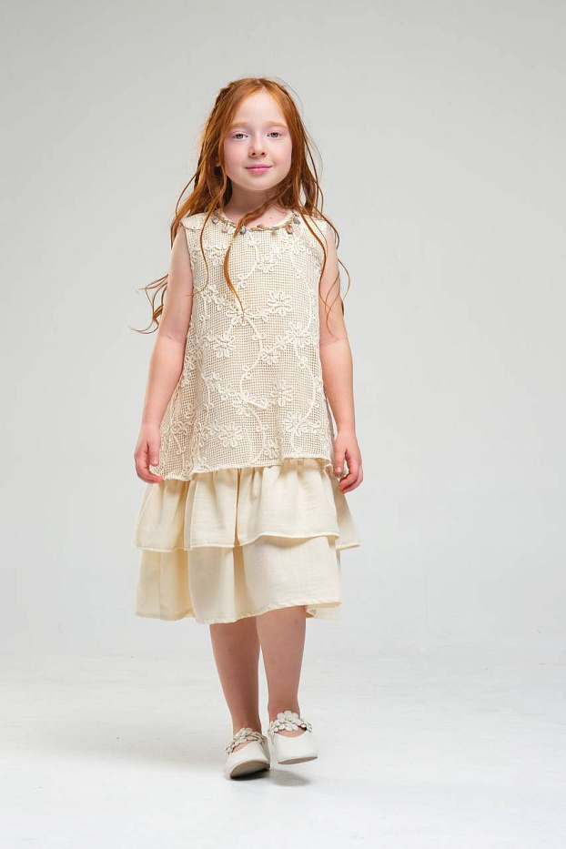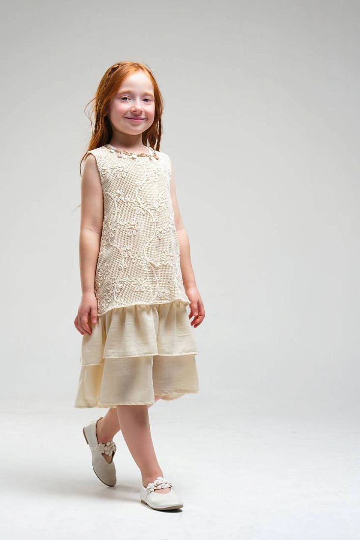 Платье для девочки выполнено в нежном светлом оттенке, что делает его универсальным выбором для различных торжественных случаев и праздников. Верхняя часть изделия украшена изящным кружевным узором с цветочным мотивом, что придает наряду романтичный и элегантный вид. Кружево отличается сложной текстурой, создающей эффект объема и утонченности. Низ изделия выполнен из легкой струящейся ткани, оформленной в виде двух ярусов, что придает платью воздушность и динамику при движении. Ярусная конструкция позволяет сохранить свободный крой, обеспечивая комфорт и удобство для активной девочки. Безрукавный фасон и круглый вырез горловины подчеркивают лаконичность дизайна и делают платье подходящим для теплого времени года. Мягкая внутренняя подкладка обеспечивает приятные ощущения на теле и предотвращает раздражение даже при длительном ношении. Материал внешнего слоя приятен на ощупь, хорошо держит форму и отличается износостойкостью.