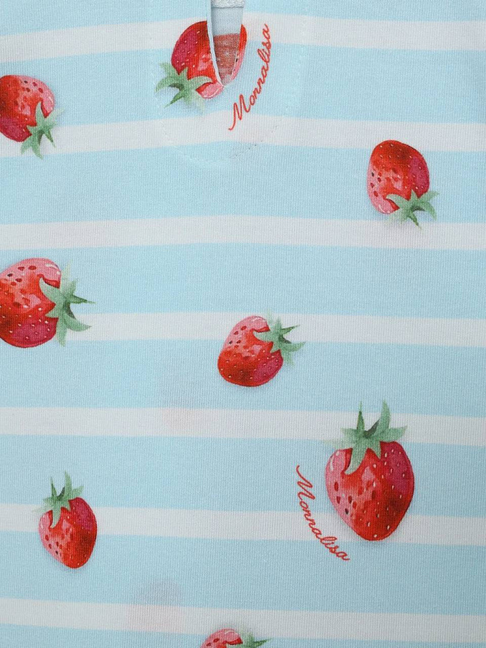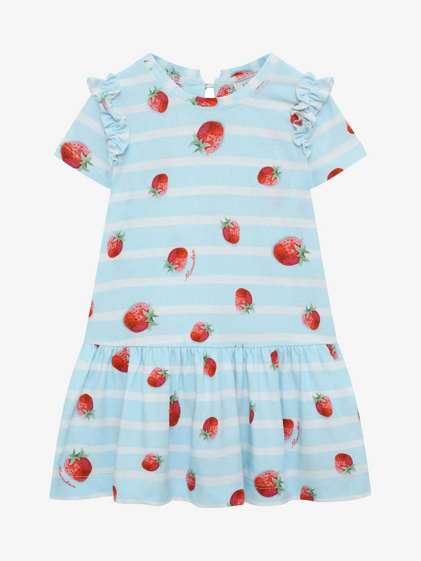 Платье выполнено из трикотажа голубого цвета в белую полоску с принтом клубники. Модель дополнена круглым вырезом и короткими рукавами с рюшами.