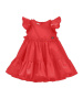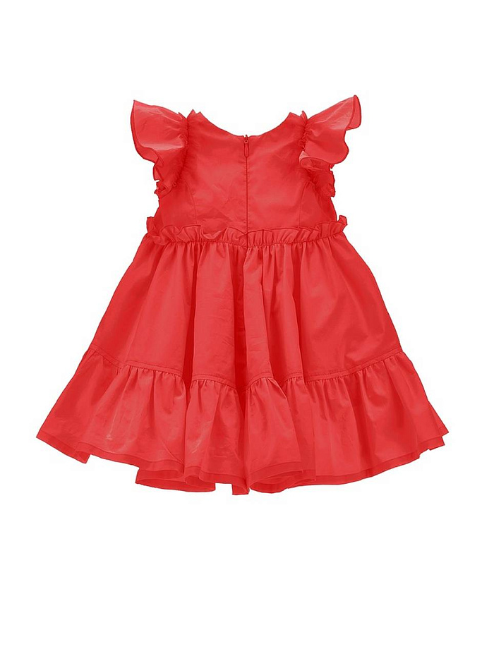 Платье для девочки выполнено из легкой и воздушной ткани, что обеспечивает комфорт даже в жаркую погоду. Яркий насыщенный цвет придает изделию праздничный и нарядный вид. Дизайн украшен воланами по рукавам, которые создают романтичный и утонченный образ. Платье имеет пышную юбку с двумя ярусами, что добавляет объем и делает модель особенно привлекательной для торжественных случаев. На груди расположен аккуратный декоративный элемент в виде небольшой эмблемы в форме сердца, что подчеркивает индивидуальность изделия. Круглый вырез горловины и рукава-крылышки делают платье удобным и стильным вариантом для девочки. Материал обладает приятной текстурой и мягко ложится по фигуре, не сковывая движений. Изделие застегивается на спинке, что обеспечивает легкость при надевании и снятии. Благодаря продуманному крою и качественной отделке платье отлично держит форму и подходит для различных мероприятий — от прогулок до праздников.