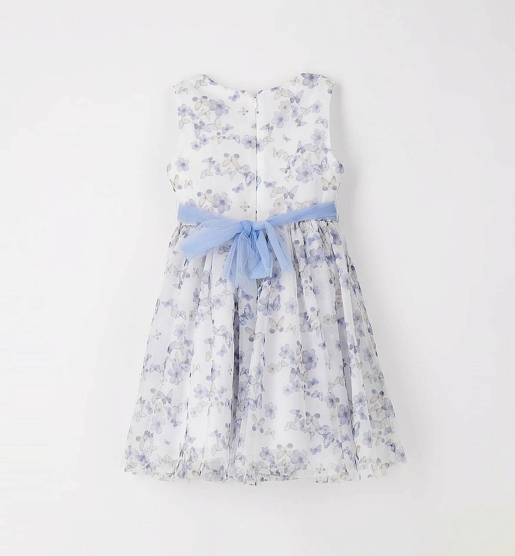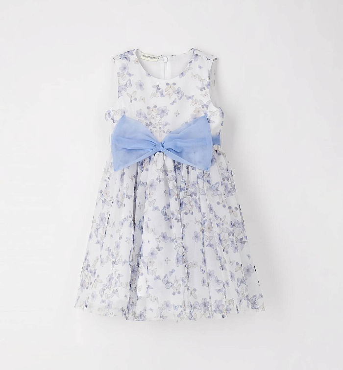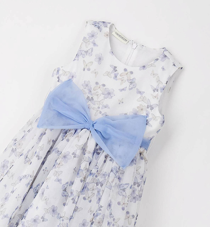Тюлевое платье без рукавов Sarabanda для девочек с узором по всей поверхности и хлопковой подкладкой. Сзади платье застегивается на невидимую молнию. Длина до колена. Пояс украшен бантом из тюля.