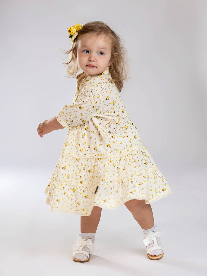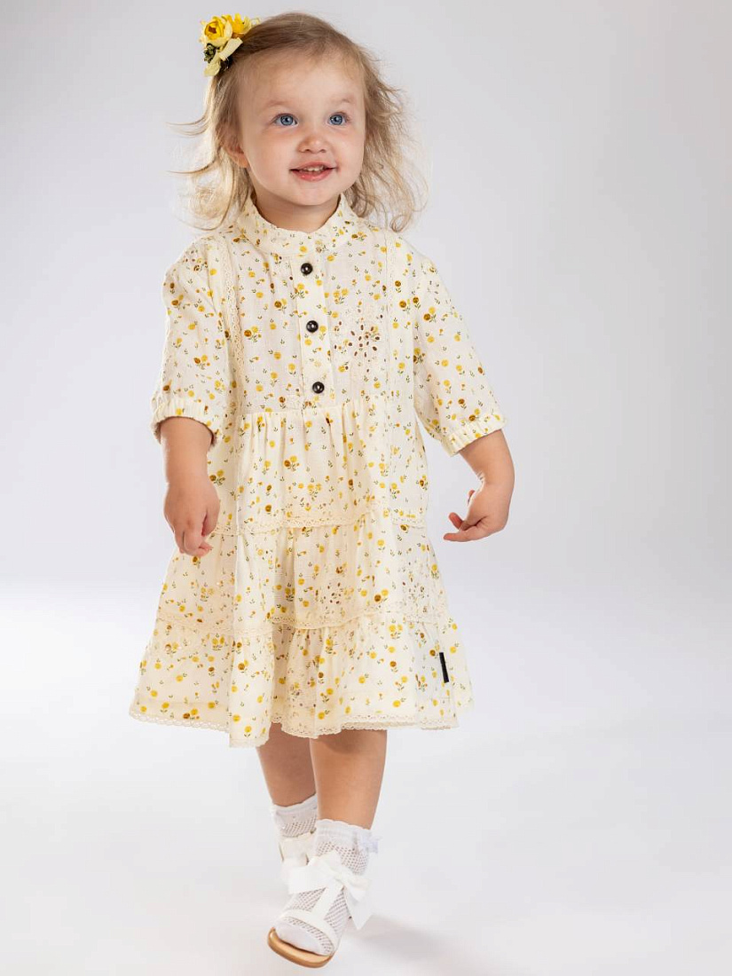 Платье для девочки выполнено из легкой ткани приятного светлого оттенка с мелким цветочным узором, что придает образу нежность и свежесть. Модель отличается свободным кроем, который не сковывает движения и обеспечивает комфорт на протяжении всего дня. Ткань платья мягкая и приятная к телу, хорошо пропускает воздух, что особенно важно для активных детей. Платье украшено аккуратными пуговицами спереди, что добавляет изделию элегантности и удобства при переодевании. Длина рукава — до локтя, что идеально подходит для любого сезона и позволяет носить платье как самостоятельно, так и в сочетании с другими элементами гардероба. На юбке присутствует несколько ярусов с легкой сборкой, придающих дополнительный объем и создающих красивый силуэт при движении. Цветочный принт выглядит стильно и гармонично, а нейтральная гамма легко сочетается с разными аксессуарами и обувью. Такое платье станет отличным выбором для повседневных прогулок, семейных праздников и фотосессий.