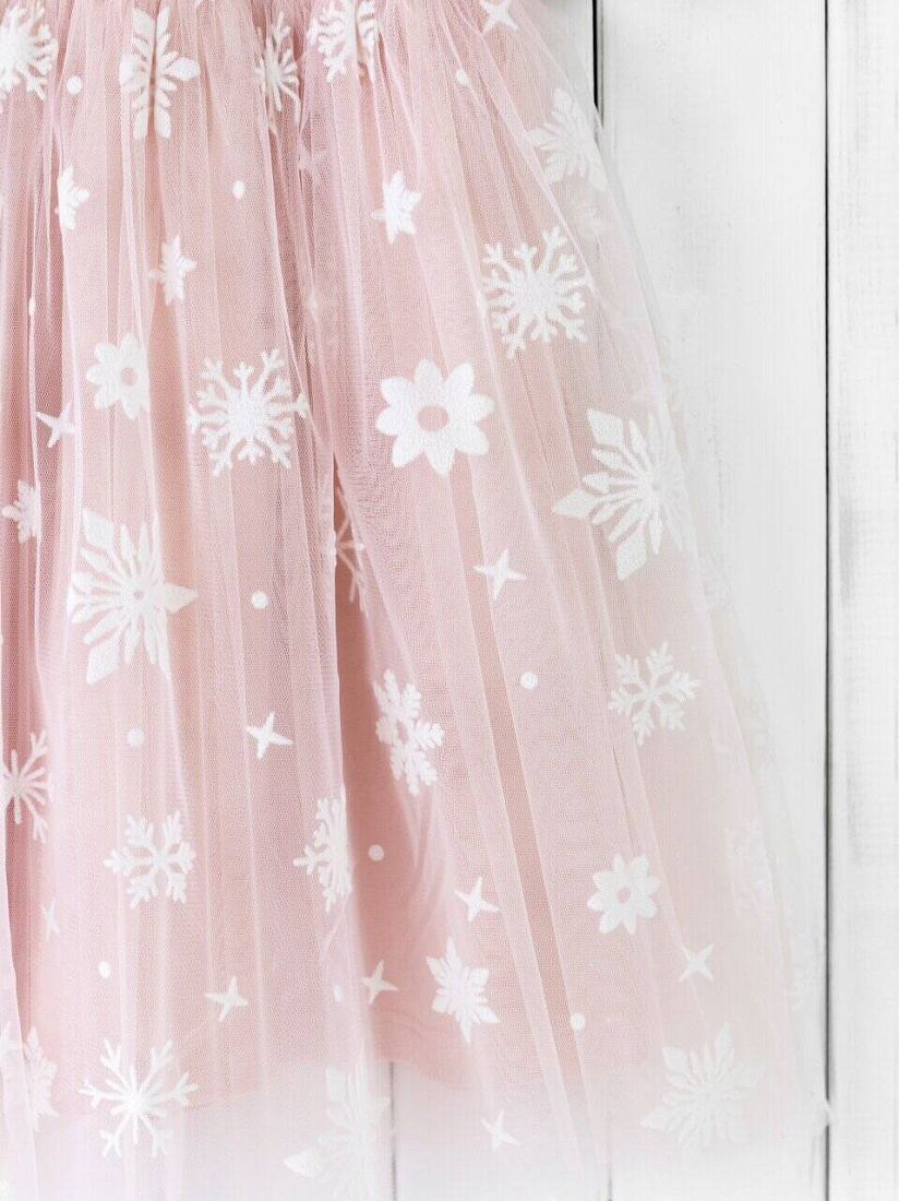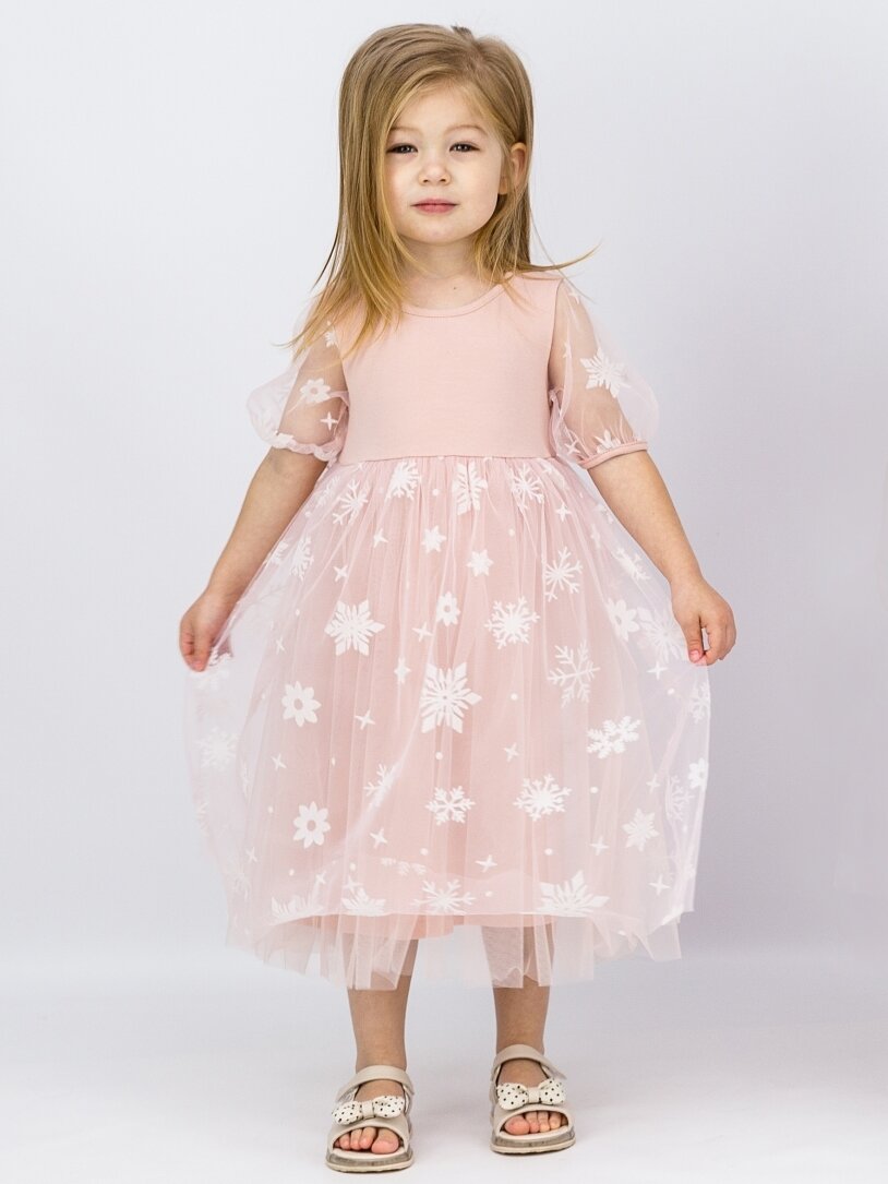 Новогоднее элегантное платье с коротким рукавом и многослойной юбкой. Рукава и верхний слой юбки выполнен из фатина с бархатистыми снежинками. Платье выполнено из эластичной кулирки, 95% хлопок, 5% эластан.