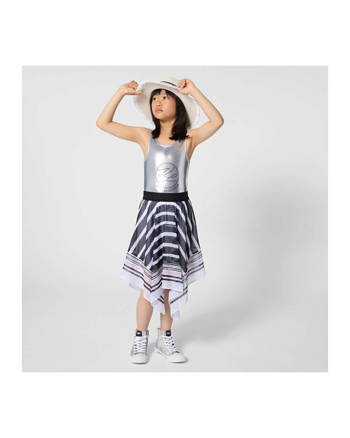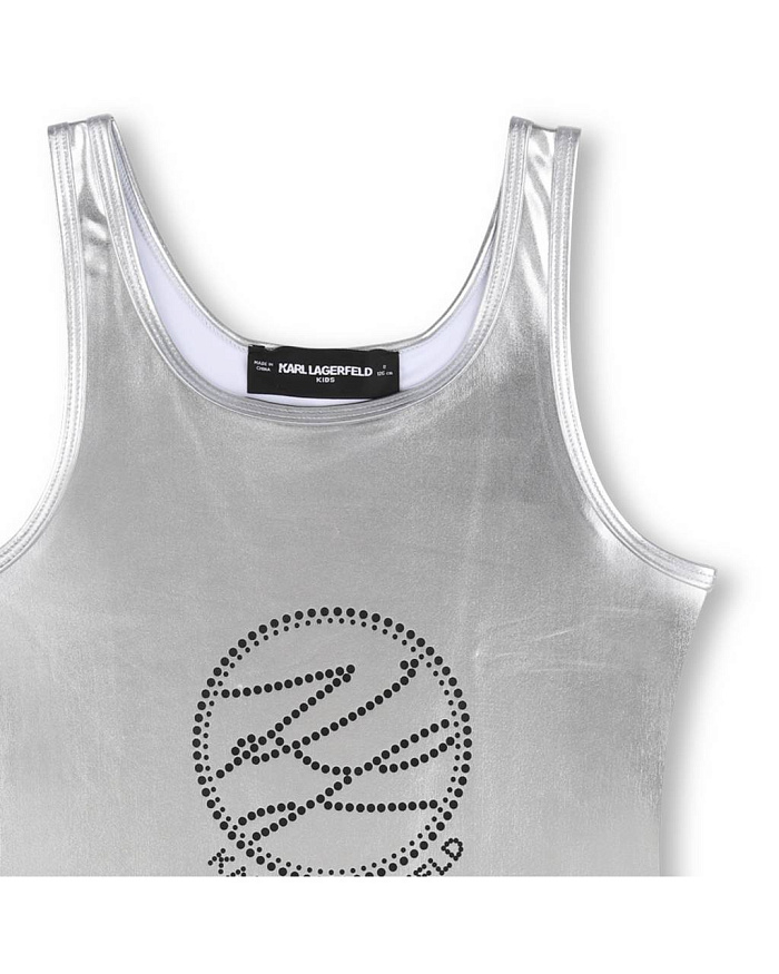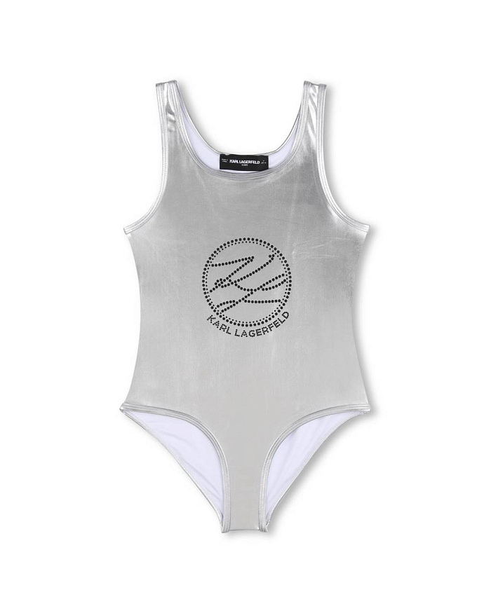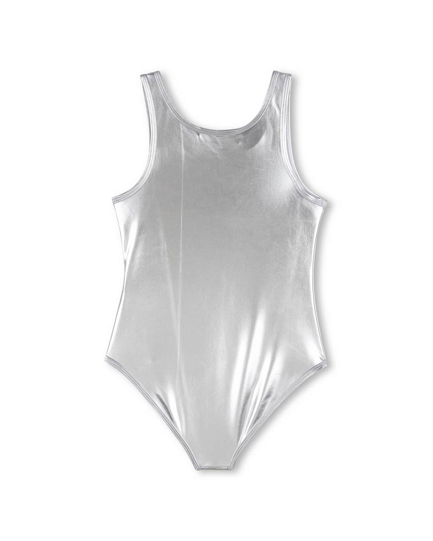 Купальник для девочки выполнен в современном однотонном стиле с акцентом на элегантность и универсальность. Модель представлена в серебристом цвете, что придает изделию яркость и делает его привлекательным для летнего отдыха и плавания. Материал купальника визуально гладкий и слегка блестящий, что создает эффект сияния на свету и подчеркивает индивидуальность. На передней части расположен крупный декоративный элемент в виде логотипа, выполненного контрастным черным цветом с использованием декоративных элементов по кругу, что добавляет оригинальности и подчеркивает современный стиль изделия.Конструкция купальника отличается удобной посадкой благодаря широким бретелям и классическому вырезу на спине. Отсутствие лишних деталей обеспечивает комфорт во время плавания и активного отдыха. Внутренняя сторона изделия выполнена в белом цвете, что подчеркивает аккуратность исполнения и обеспечивает дополнительное удобство при носке.