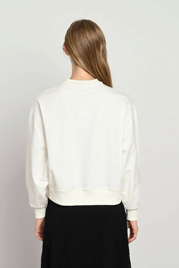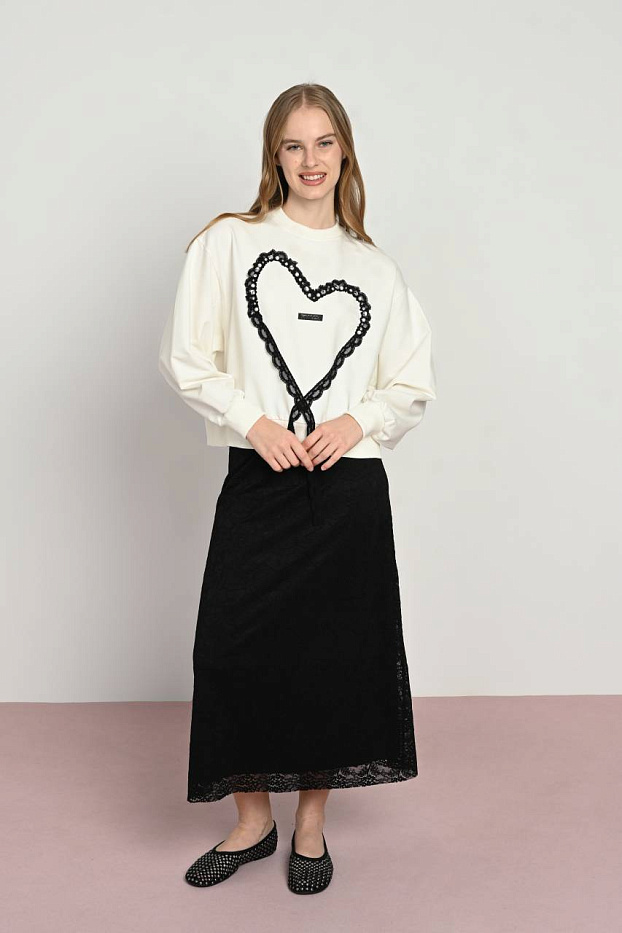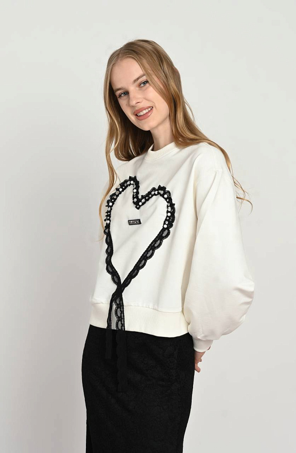 Мягкий свитшот экрю вдохновляет на создание стильных и комфортных образов. Изделие выполнено из качественного материала, обеспечивающего приятное ощущение на коже и удобство в носке в любое время года. Особое внимание привлекает дизайн с изящным сердцем, выполненным из черного кружева. Эта деталь придает модели уникальность и добавляет легкую нотку романтики. Свитшот отлично сочетается с разнообразными предметами гардероба, позволяя создавать как повседневные, так и более нарядные ансамбли. Практичный цвет позволяет легко комбинировать вещь с аксессуарами и обувью разных оттенков. Модель подходит для тех, кто ценит стильные детали и комфорт одновременно. Верхняя одежда с таким оформлением станет ярким акцентом в вашем образе и подчеркнет индивидуальность. Крой изделия продуман для свободы движений и удобства при длительном ношении. Кремовый оттенок изделия гармонирует с деликатным узором кружева, создавая изящное и современное сочетание.