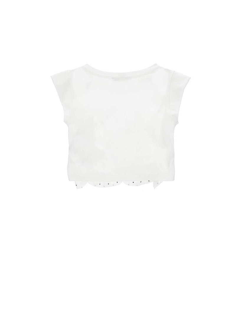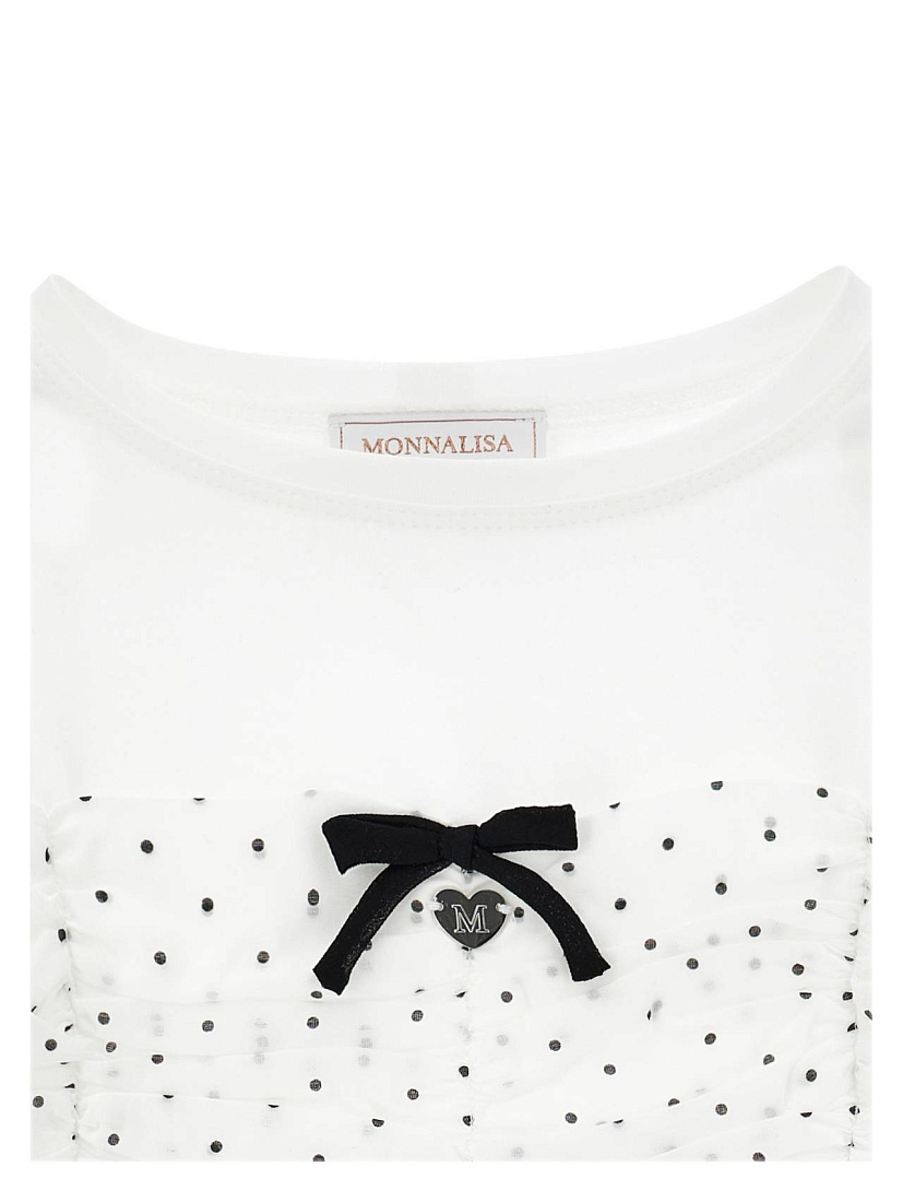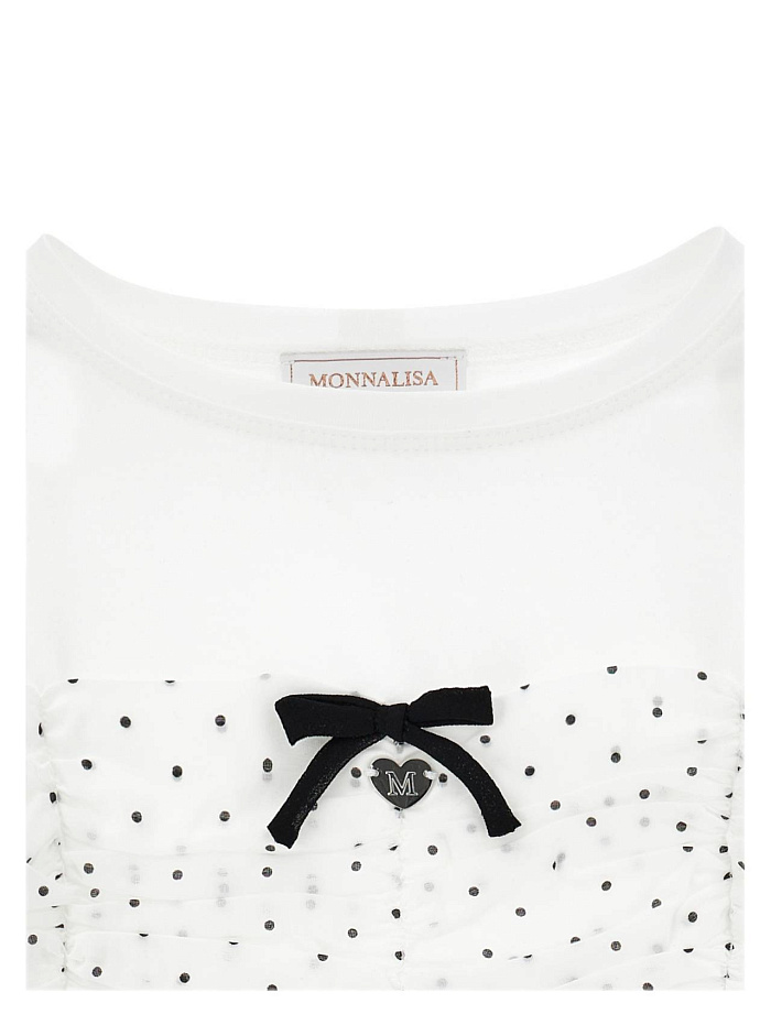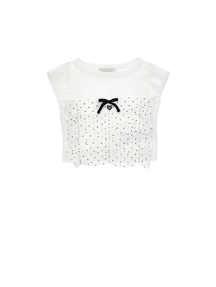 Топ для девочки выполнен из легкой и приятной на ощупь ткани, которая обеспечивает комфорт в течение всего дня. Модель представлена в классическом белом цвете, что делает ее универсальной для сочетания с различными элементами гардероба. Передняя часть украшена нежным узором из мелких черных точек, который придает изделию аккуратный и изысканный вид. В центре топа размещен небольшой черный бантик, добавляющий оригинальности и подчеркивающий стильный дизайн. Короткие рукава и свободный крой обеспечивают удобство движений, что особенно важно для активной девочки. В нижней части изделия присутствует ажурная отделка с волнистым краем, которая создает дополнительный декоративный акцент и подчеркивает легкость образа. Топ подойдет как для повседневной носки, так и для праздничных случаев, благодаря сочетанию лаконичности и элегантности. Материал изделия дышащий и хорошо держит форму, что позволяет сохранить аккуратный внешний вид даже после стирки.