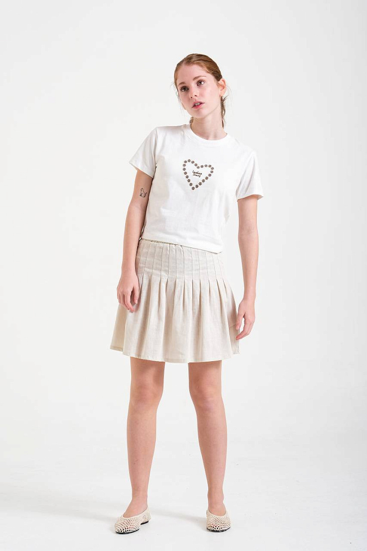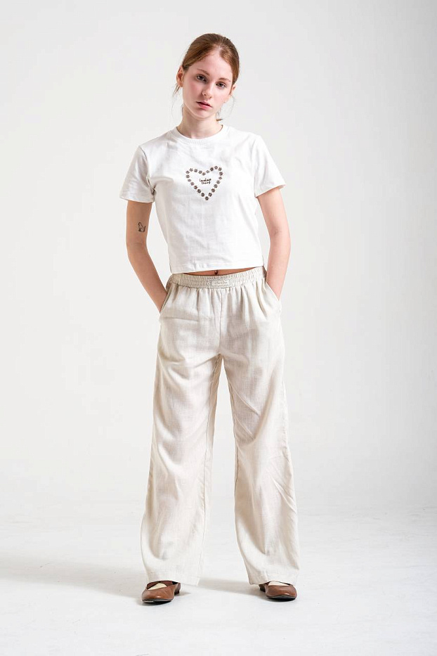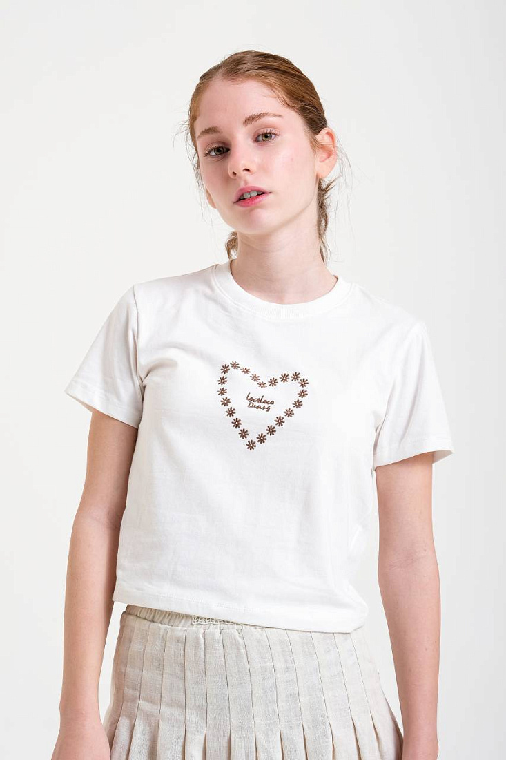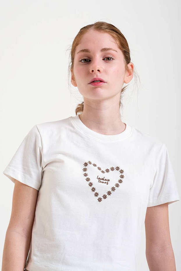 Топ для девочки выполнен из легкого и мягкого материала, который обеспечивает комфорт при носке в течение всего дня.Бежевый цвет создает свежий и универсальный образ, легко сочетается с разной одеждой. Дизайн топа отличается лаконичностью и аккуратностью: на груди расположен принт в форме сердца, составленный из мелких цветочных элементов, а в центре размещена надпись. Короткие рукава и свободный крой делают этот топ отличным выбором для повседневных образов, прогулок и встреч с друзьями. Круглый вырез аккуратно оформлен, а ткань хорошо держит форму и не сковывает движений. Топ подходит для создания легких и стильных комплектов как с юбками, так и с брюками. Материал топа приятен на ощупь, дышащий и не вызывает раздражения на коже, что особенно важно для девочки. Визуальная структура ткани гладкая, без лишних деталей, что подчеркивает чистоту и простоту стиля. Принт выполнен в нейтральных оттенках, что добавляет изысканности и подходит для любого сезона.
