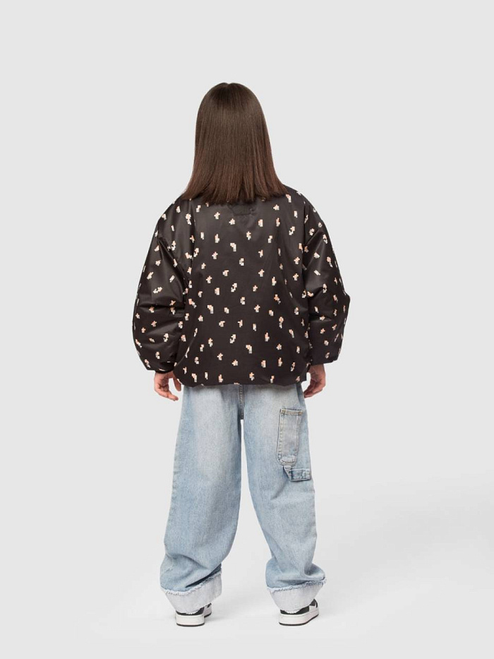 Оригинальная куртка бомбер оверсайз для девочки — современная и практичная модель, созданная для активных прогулок и повседневной носки. Верх выполнен из ткани с водоотталкивающей пропиткой и украшен милым пиксельным цветочным принтом, который придаёт образу свежести и игривости. Внутренняя подкладка — из мягкого полиэстера, а утеплитель Thermofin плотностью 100 г/м² обеспечивает оптимальное тепло и лёгкость, делая куртку комфортной в межсезонье при температуре от 0 до +10 °C. Модель оснащена тёплым трикотажным воротником и эластичными трикотажными манжетами, которые хорошо защищают от ветра и удерживают тепло. Удобная центральная молния дополняется внутренней ветрозащитной планкой и клапаном защитой у подбородка, предотвращающим защемления и обеспечивающим комфорт при застёгивании. Практичность усилена двумя глубокими накладными карманами, куда удобно положить мелочи или согреть руки. По нижней части изделия проходит регулируемая кулиска со стопперами — она позволяет подстроить объём и создать нужный силуэт.