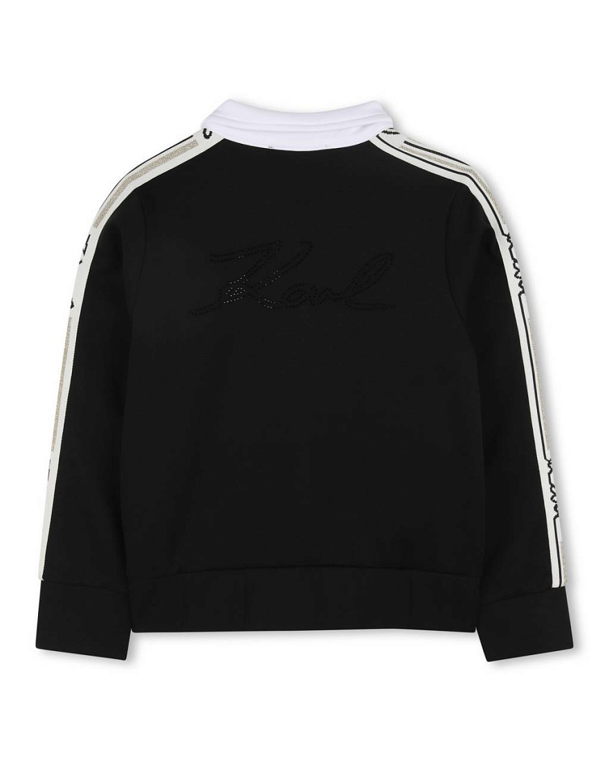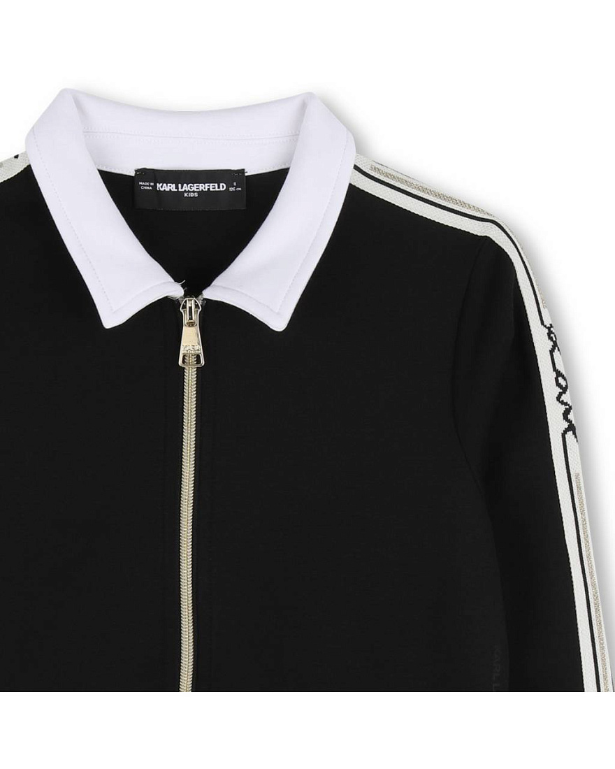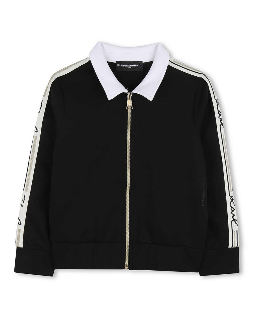 Куртка для девочки выполнена в современном стиле и отлично подойдет для повседневной носки. Модель представлена в черном цвете с контрастными белыми вставками, что делает ее универсальной и легко сочетаемой с различными элементами гардероба. Основной материал визуально напоминает гладкую, плотную ткань, приятную на ощупь и хорошо сохраняющую форму. По рукавам проходят белые лампасы с декоративным принтом, придающим куртке оригинальность и подчеркивающим индивидуальность. Воротник классического кроя, белого цвета, выделяется на фоне основной части изделия, создавая аккуратный и стильный образ. Застежка на молнии обеспечивает удобство и позволяет легко надевать и снимать куртку, а также регулировать степень открытости в зависимости от погодных условий. Манжеты на рукавах и по низу куртки выполнены в тон основной ткани, обеспечивая плотное прилегание и защищая от ветра. Куртка для девочки хорошо подходит для прогулок, учебы или активного отдыха.
