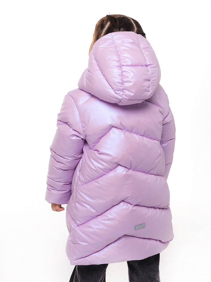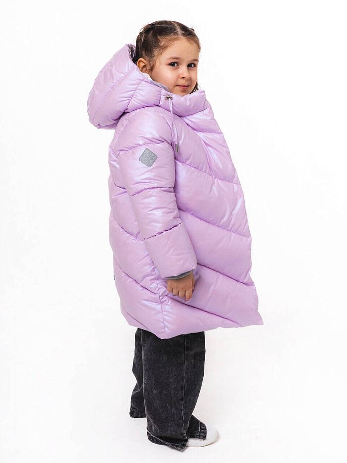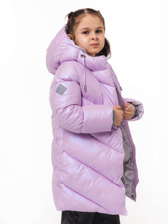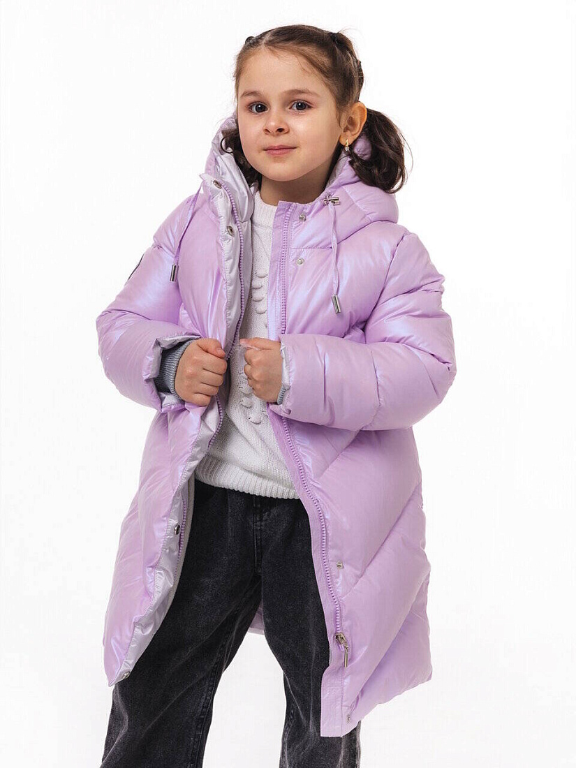 Эффектное уютное пальто из ткани с мягким блеском. Симпатичное дополнение - отделка внутренних деталей тканью серебристого цвета. Утеплитель - искусственный пух. Уютная подкладка из флиса. Красивые и функциональные стежки. Серебристая фронтальная молния размещена под цельнокроеным правым бортом. Правый борт фиксируется потайными кнопками. Карманы, расположенные в боковых швах, закрываются на потайные молнии. Внутренние трикотажные манжеты с люрексом с цвет отделочной ткани. Несъемный капюшон. Регулировка лицевой части капюшона выполнена из окантовочной тесьмы с наконечниками. В боковом шве светоотражающий флажок, на рукаве и на спинке - светоотражающие нашивки.