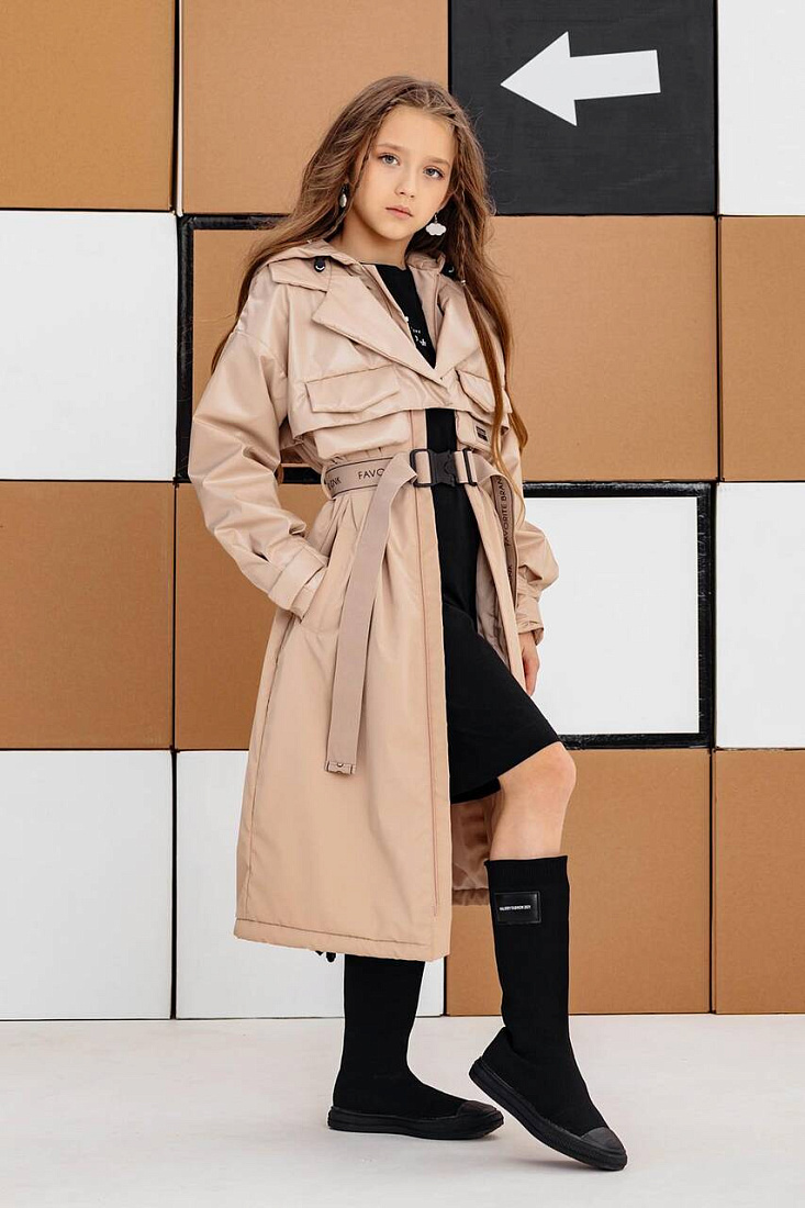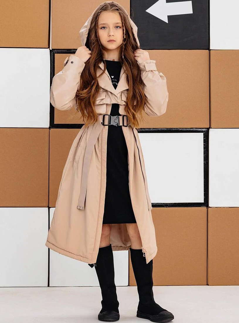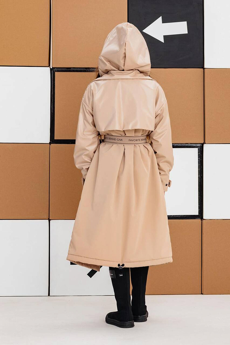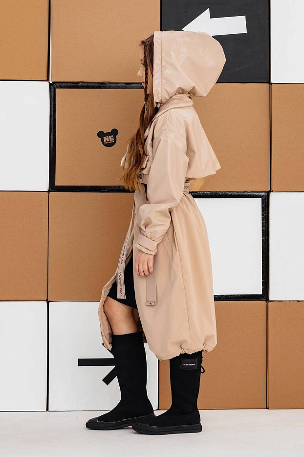 Плащ - прямого силуэта. Застежка - центральная на молнию с ветрозащитной планкой . Рукав втачной, со спущенной линией плеча.Низ рукава оформлен формообразующими складами и патами, застегивающимися на кнопки и возможностью регулировки. На переде обработаны прорезные карманы с листочкой . Отлетная кокетка с отложным воротником и лацканами и с застежкой на потайную кнопку имитирует укороченный жакет,надетый вторым слоем . На переде кокетки обработаны горизонтальные прорезные карманы с листочкой и клапаном и провисающей подкладкой. Капюшон не отстёгивающийся, по краю капюшона кулиса регулируемая шнуром резинкой и сто