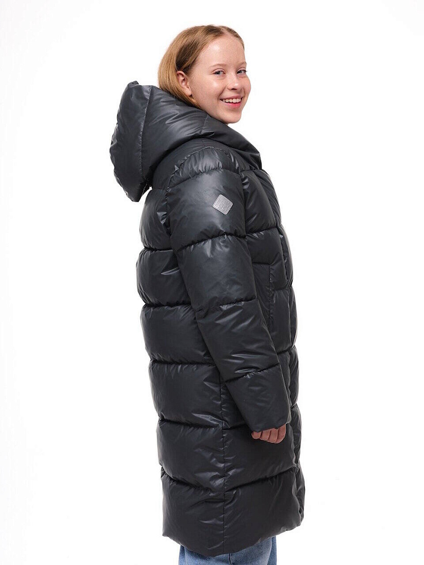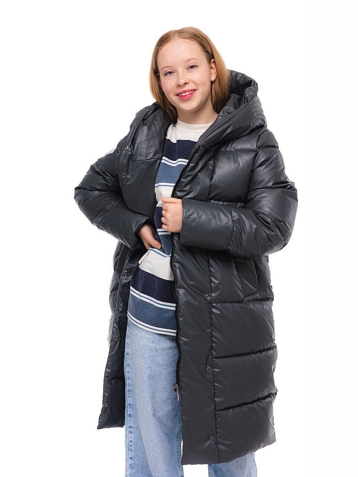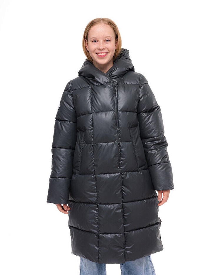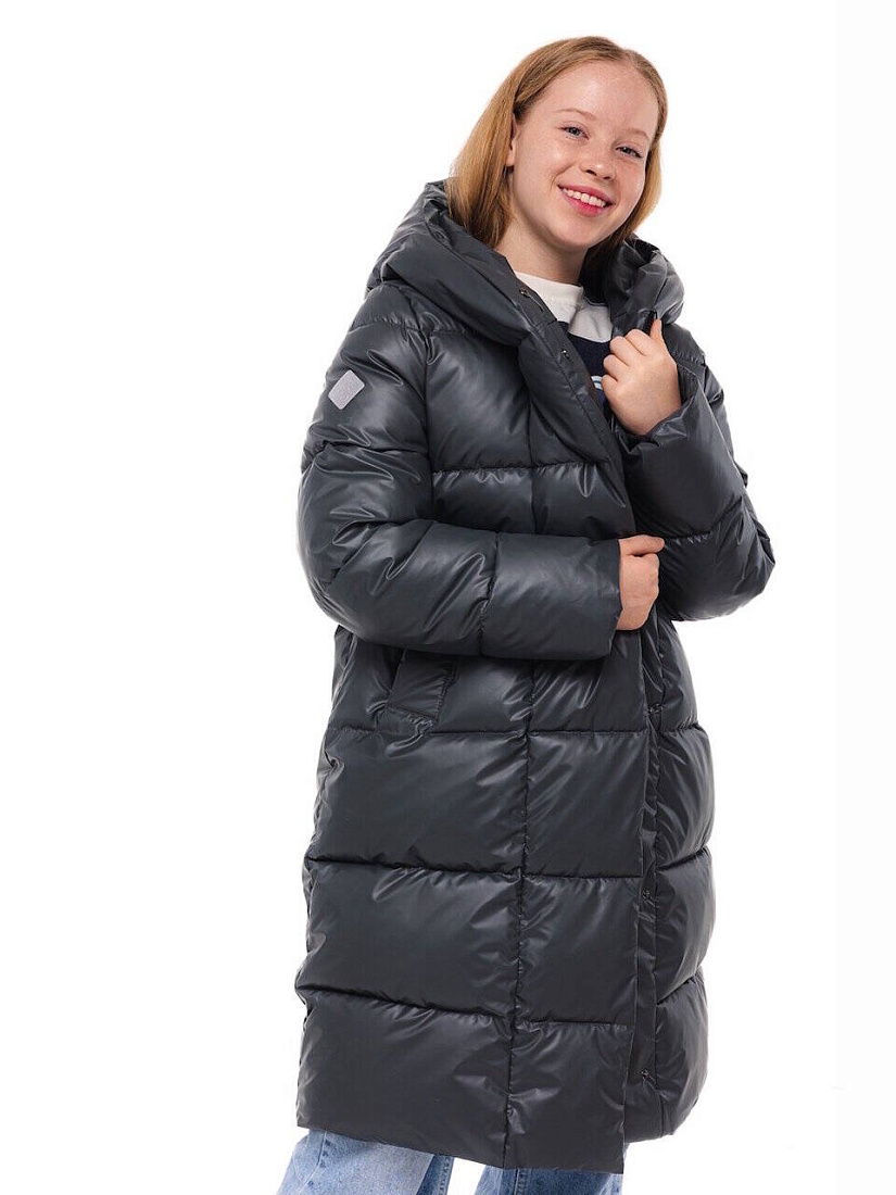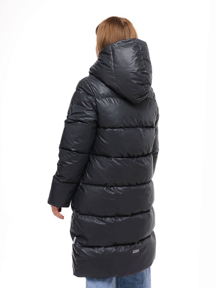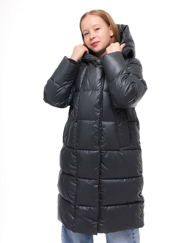 Объемное, уютное пальто на утеплителе из искусственного пуха – хит сезона. Ткань меланжевая с плотной пропиткой. Функциональные стежки. Фронтальная молния разместилась под расширенным и отстроченным правым бортом, который фиксируется потайными кнопками. Глубокие теплые карманы расположены на линии талии и оформлены широкими листочками. Из декораций на листочке левого кармана металлическая нашивка. Внутренний карман на молнии. Внутренние трикотажные манжеты. Капюшон несъемный оригинальной формы переходит в борта пальто и хорошо закрывает шею и грудь от холода. На спинке и рукаве пальто светоотражающие нашивки, в боковом шве - светоотражающий флажок.