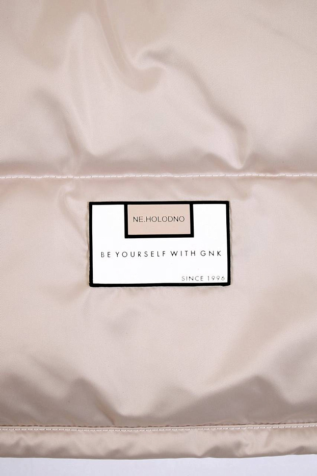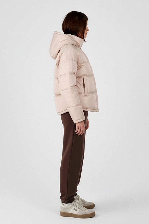 Куртка прямого силуэта. Рукав втачной, со спущенной линией плеча. Застежка центральная на тесьму-молнию, с верхней ветрозащитной планкой, застегивающейся на потайные кнопки. Воротник стойка с застежкой на потайные кнопки. Изделие стегано широкими горизонтальными переборками. На переде обработаны вертикальные прорезные карманы с листочкой. Низ рукавов и фигурный низ изделия обработаны бейкой. Капюшон одношовный, стеганый прямыми переборками. По краю капюшона выполнена кулиса, регулируемая шнуром и стопорами.