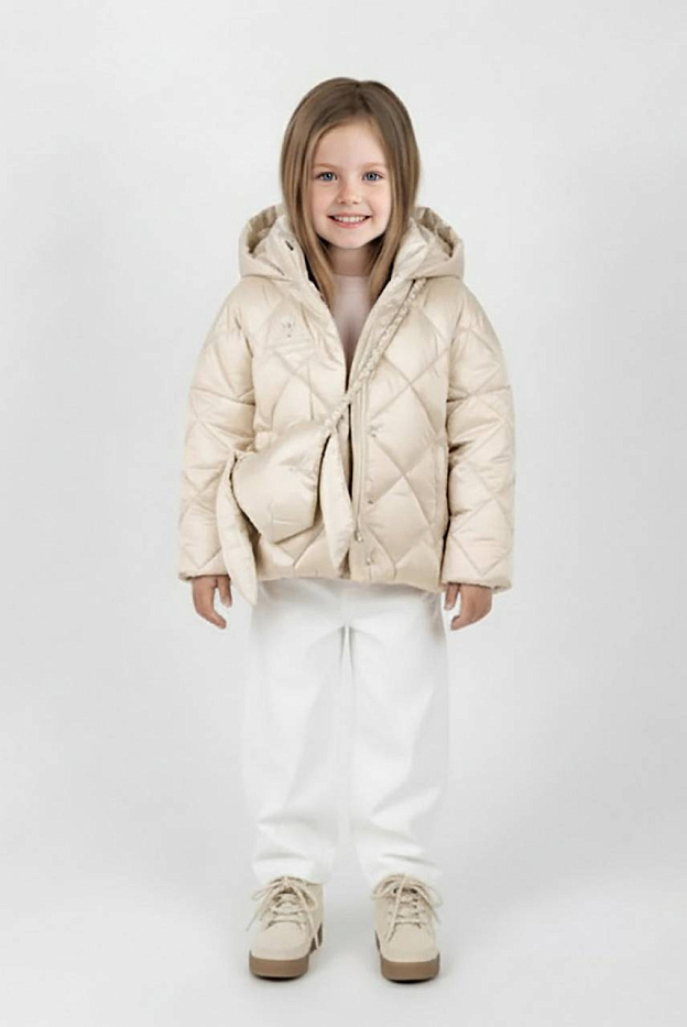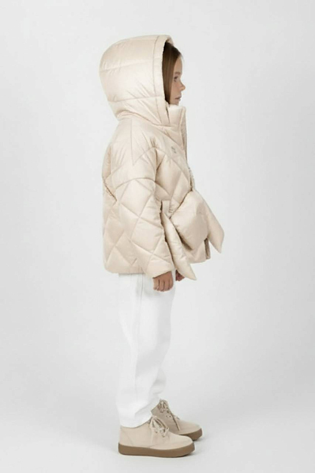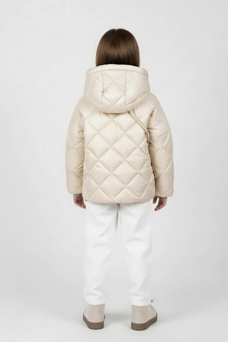 Куртка прямого силуэта. Рукав втачной, на основе цельнокроенного. Застежка центральная на тесьму-молнию, с цельнокроеной верхней ветрозащитной планкой, застегивающейся на потайные кнопки. Воротник стойка. На переде выполнены боковые вертикальные прорезные карманы с листочками. Изделие стеганое ромбами. Капюшон несъёмный, одношовный, стеганый прямыми переборками. По краю капюшона отрезная кулиса, собранная в центральной части нарезинку. Для комфортного прилегания низ изделия и низ рукава присобраны на резинку. В комплекте с курткой предусмотрена сумка.