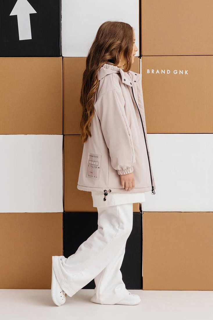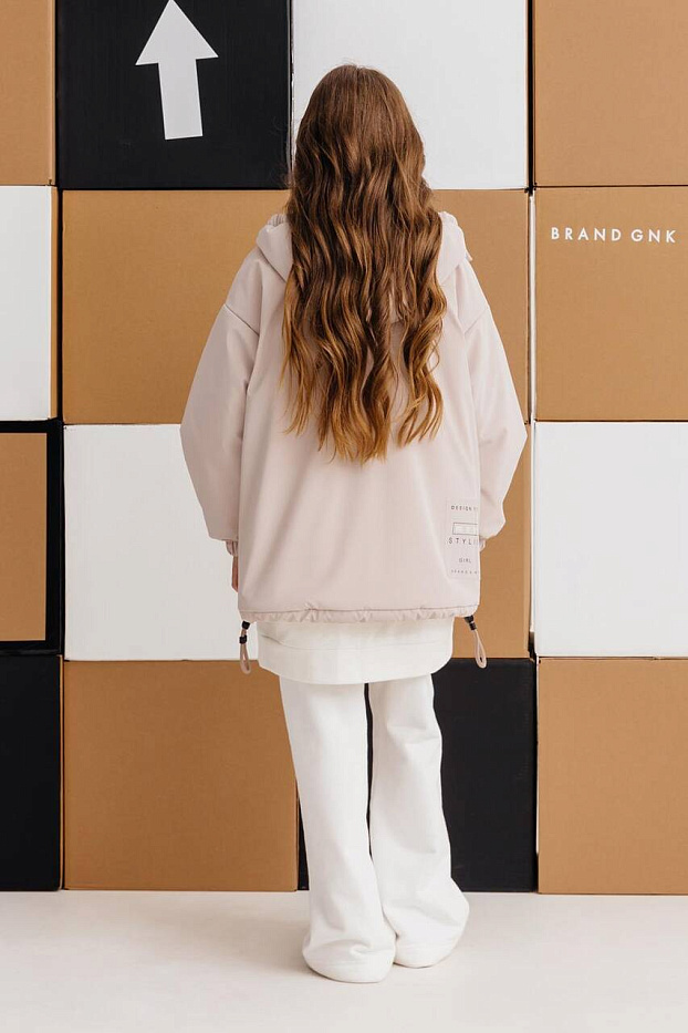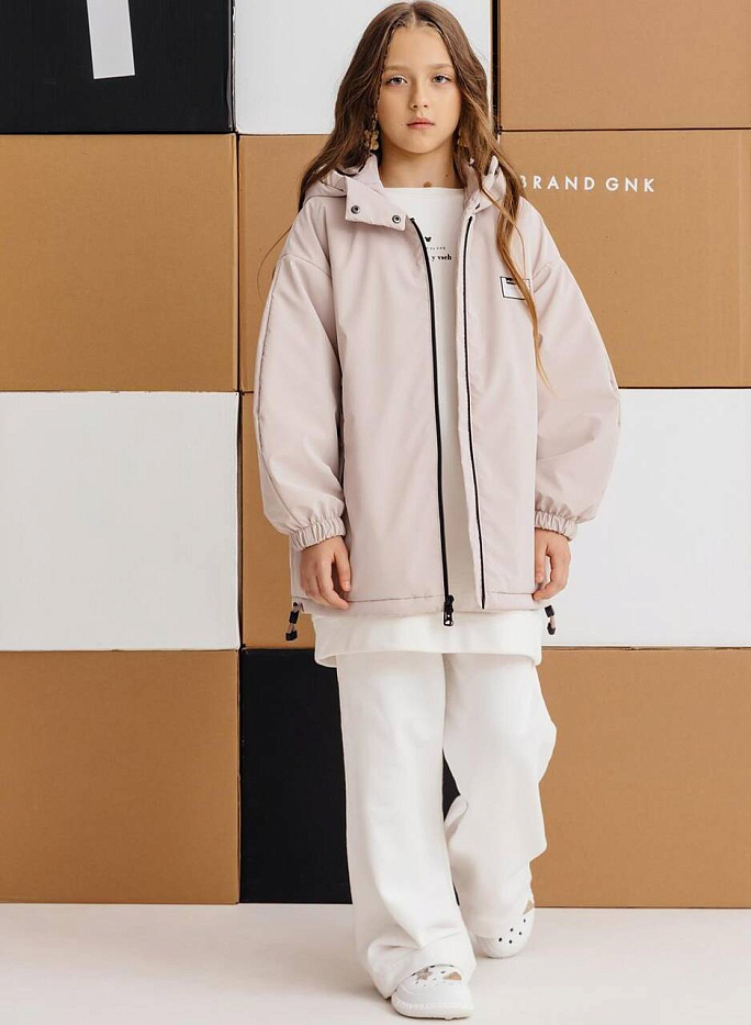 Ветровка удлиненная, прямого силуэта. Рукав втачной, со спущенной мягкой линией плеча. Застежка – центральная на тесьму-молнию с нижней ветрозащитной планкой. Воротник-стойка цельнокроеный с капюшоном, застегивающийся на потайные кнопки. На переде выполнены вертикальные прорезные карманы с листочкой. Округлая форма рукава создана за счет среднего шва. Низ рукавов оформлен манжетами на резинке. По краю капюшона обработана кулиса на резинку. По низу изделия выполнена кулиса, регулируемая шнуром, фиксаторами и ограничителями.
