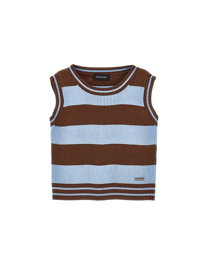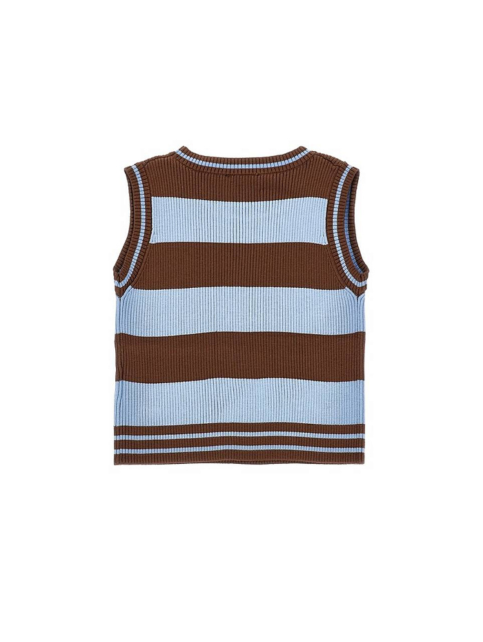 Жилет для девочки выполнен в классическом стиле без рукавов, что обеспечивает свободу движений и комфорт в повседневной носке. Модель украшена широкими горизонтальными полосами, чередующимися между светло-голубым и коричневым цветами. Материал изделия выглядит мягким и приятным на ощупь, с выраженной текстурой трикотажа, что делает жилет универсальным вариантом для любого времени года. Круглый вырез горловины аккуратно обработан, что способствует удобству при надевании и снятии. Дизайн изделия лаконичен, благодаря чему жилет легко комбинируется с различными элементами гардероба, подходит для школы, прогулок или домашних занятий. На нижней части жилета предусмотрена декоративная нашивка, придающая изделию завершенный вид. Эластичная отделка по краям обеспечивает хорошую посадку на фигуре. Благодаря сочетанию цветов жилет смотрится стильно и современно, делая образ девочки более ярким и запоминающимся.