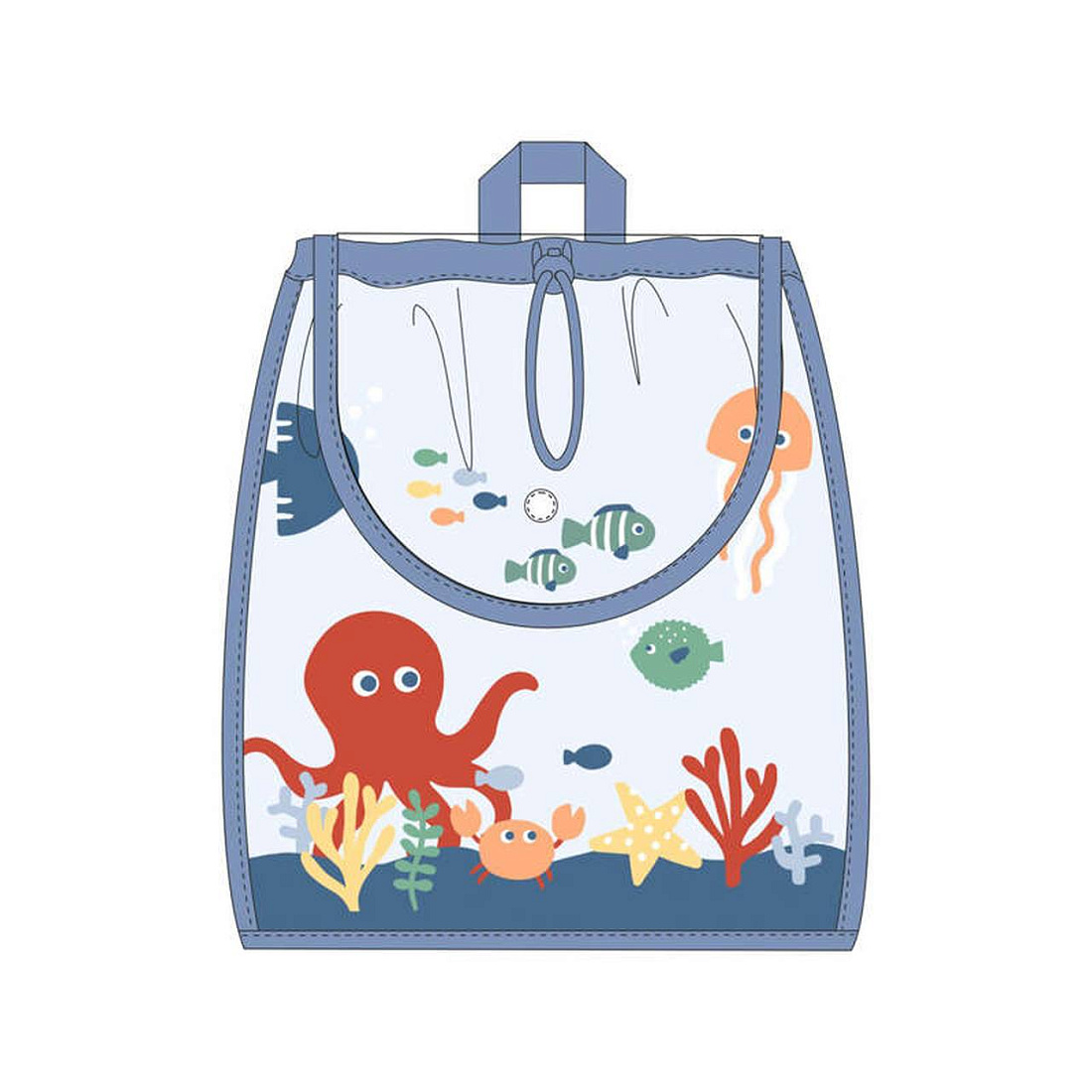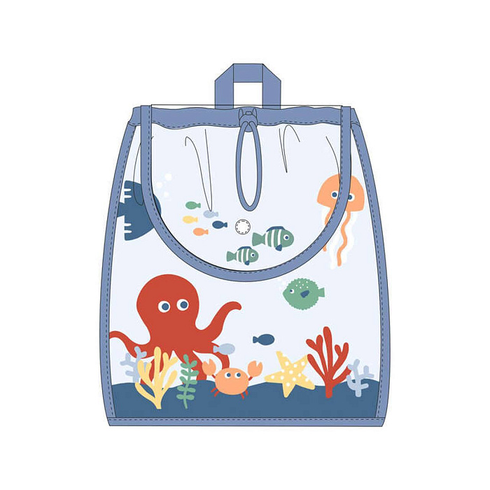Рюкзак оформлен в ярком и привлекательном стиле с морскими мотивами. На лицевой стороне изображены мультяшные морские обитатели: осьминог, краб, медуза, рыбы, морская звезда и кораллы, что делает изделие особенно интересным для детей. Основной цвет изделия — светлый с синим кантом, что придает ему аккуратный и опрятный вид. Верхняя часть закрывается на шнурок, что обеспечивает удобство и легкость доступа к содержимому. Верхняя ручка позволяет переносить изделие в руке или подвешивать на крючок. Материал визуально выглядит как легкая и износостойкая ткань, приятная на ощупь и простая в уходе. Дизайн выполнен в лаконичном стиле, без лишних деталей, что подчеркивает простоту и функциональность. Прозрачная часть фасада позволяет быстро находить нужные вещи внутри, а яркие рисунки создают позитивное настроение. Конструкция мягкая, без жестких вставок, что делает рюкзак комфортным для ежедневного использования и хранения детских принадлежностей, игрушек или одежды.