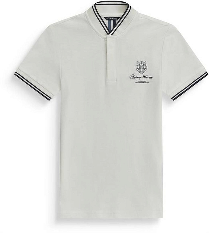 Футболка для мальчика выполнена в классическом белом цвете, который легко сочетается с различной одеждой и подходит для повседневного ношения. Модель имеет короткие рукава и прямой крой, обеспечивающий свободу движений и комфорт на протяжении всего дня. Воротник выполнен в стиле поло, с контрастными полосками по краю, что придает изделию аккуратный и стильный вид. Застежка на груди выполнена без видимых пуговиц, что добавляет лаконичности и современности дизайну. На груди расположен небольшой вышитый элемент с текстом и декоративной эмблемой, что подчеркивает индивидуальность футболки и выделяет ее среди других моделей. Манжеты рукавов украшены тонкими полосками, гармонирующими с оформлением воротника, что создает завершенный и продуманный образ. Материал футболки визуально выглядит мягким и приятным на ощупь, хорошо пропускает воздух, что особенно важно для активных мальчиков.