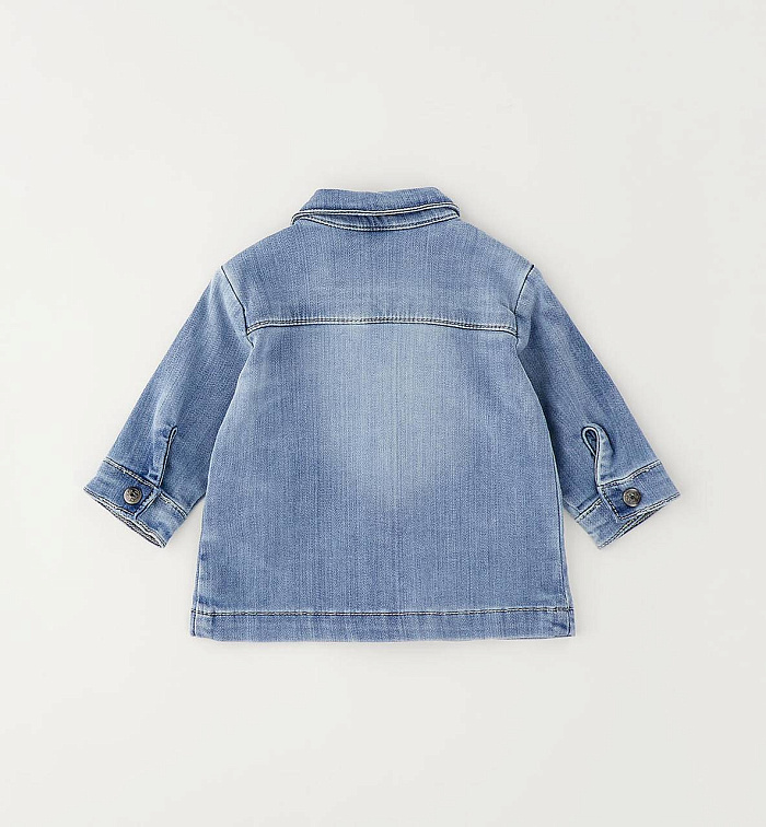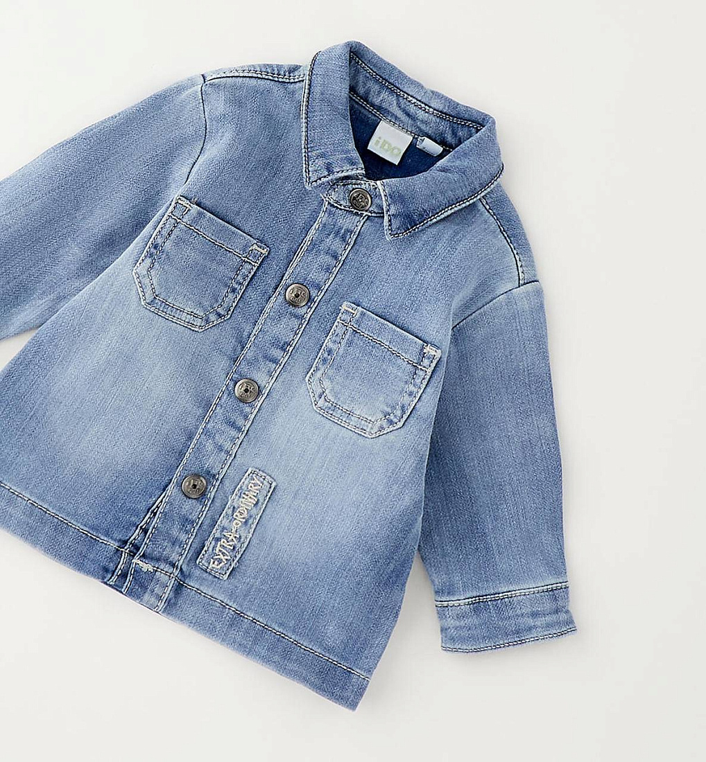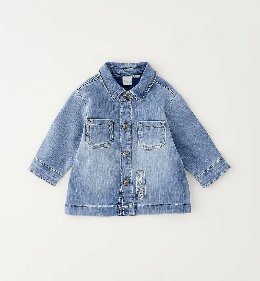 Детская рубашка iDO для детей от 12 до 24 месяцев из мягкого эластичного хлопкового денима. Свободный крой, застежка на кнопки. Передние карманы.